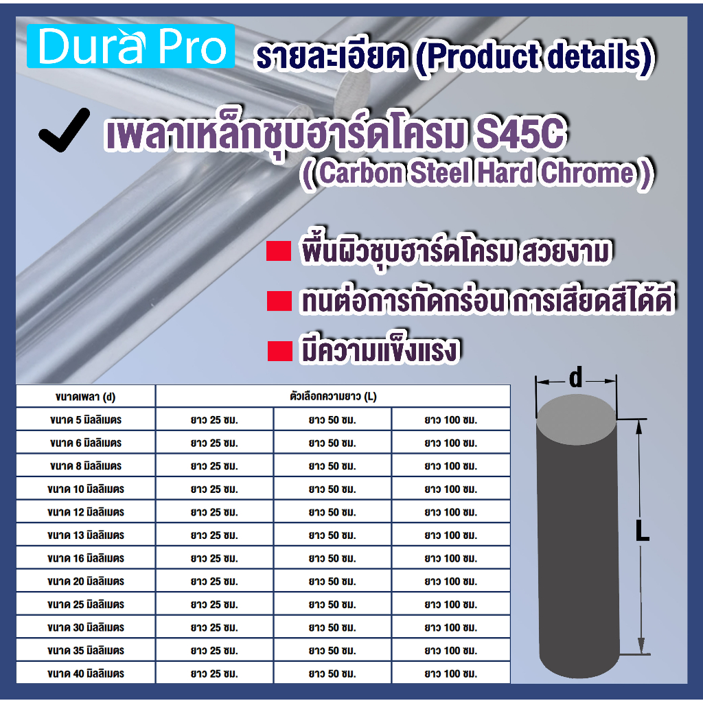 เพลาฮาร์ดโครม เพลาเหล็กชุบฮาร์ดโครม S45C (Carbon Steel Hard Chrome) ขนาด 8 / 10 / 12 มิล ยาว 25 / 50 / 100 cm เหล็กเพลา