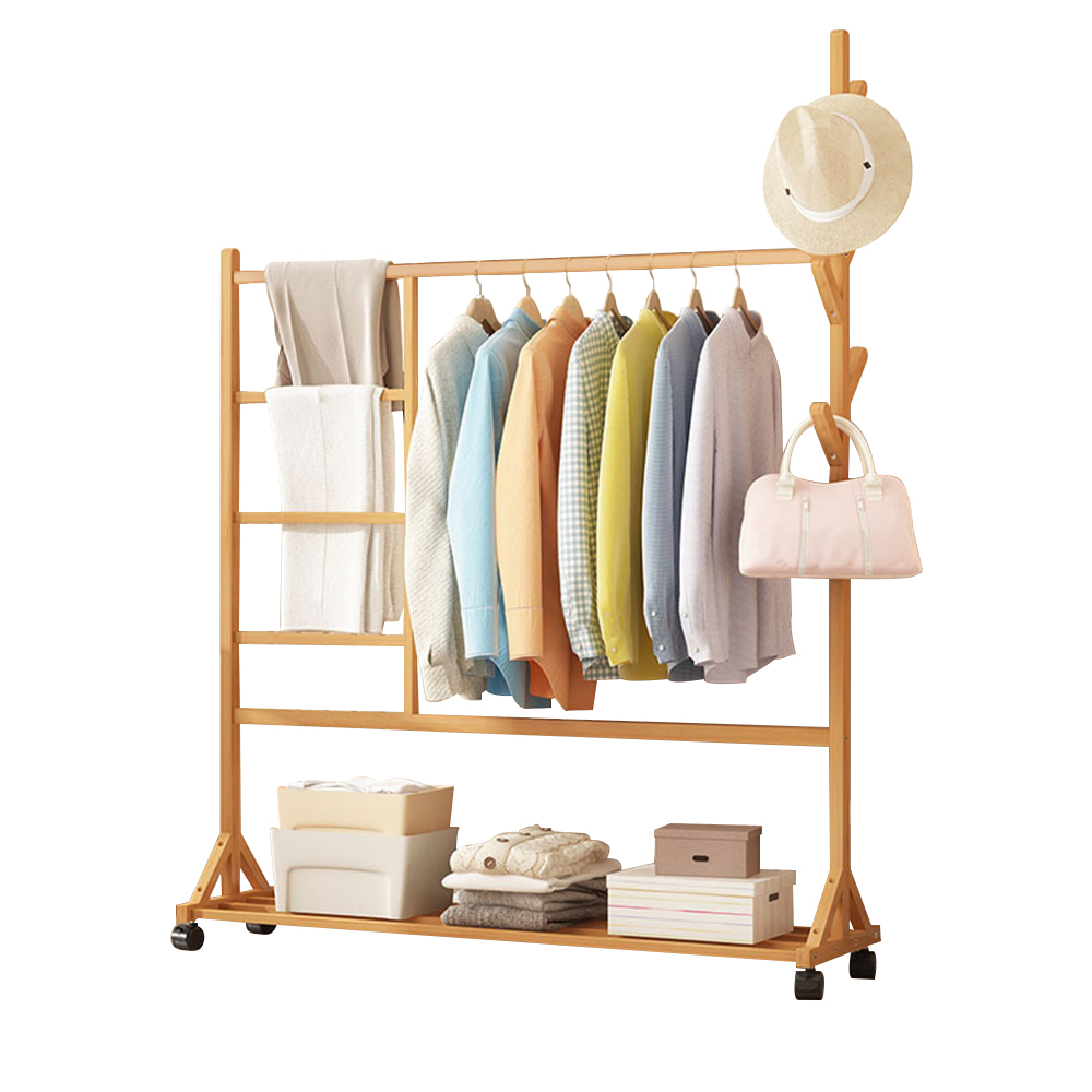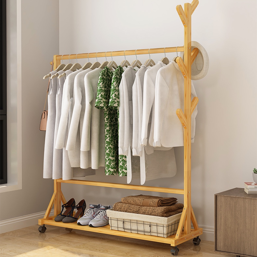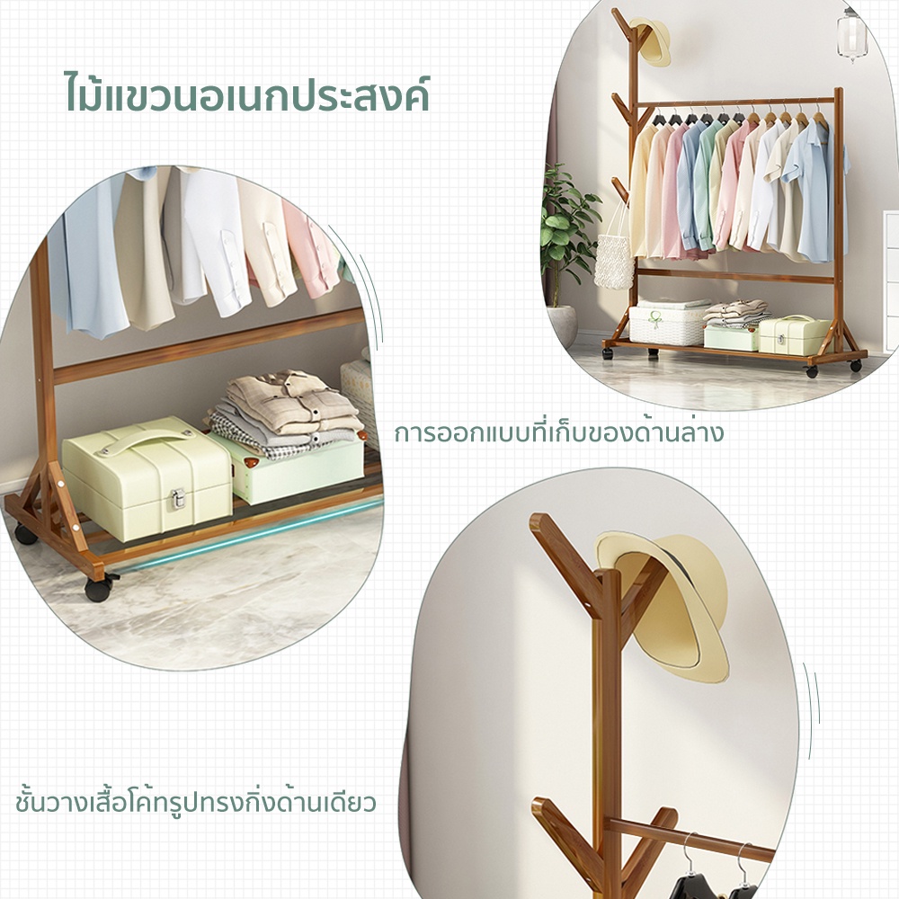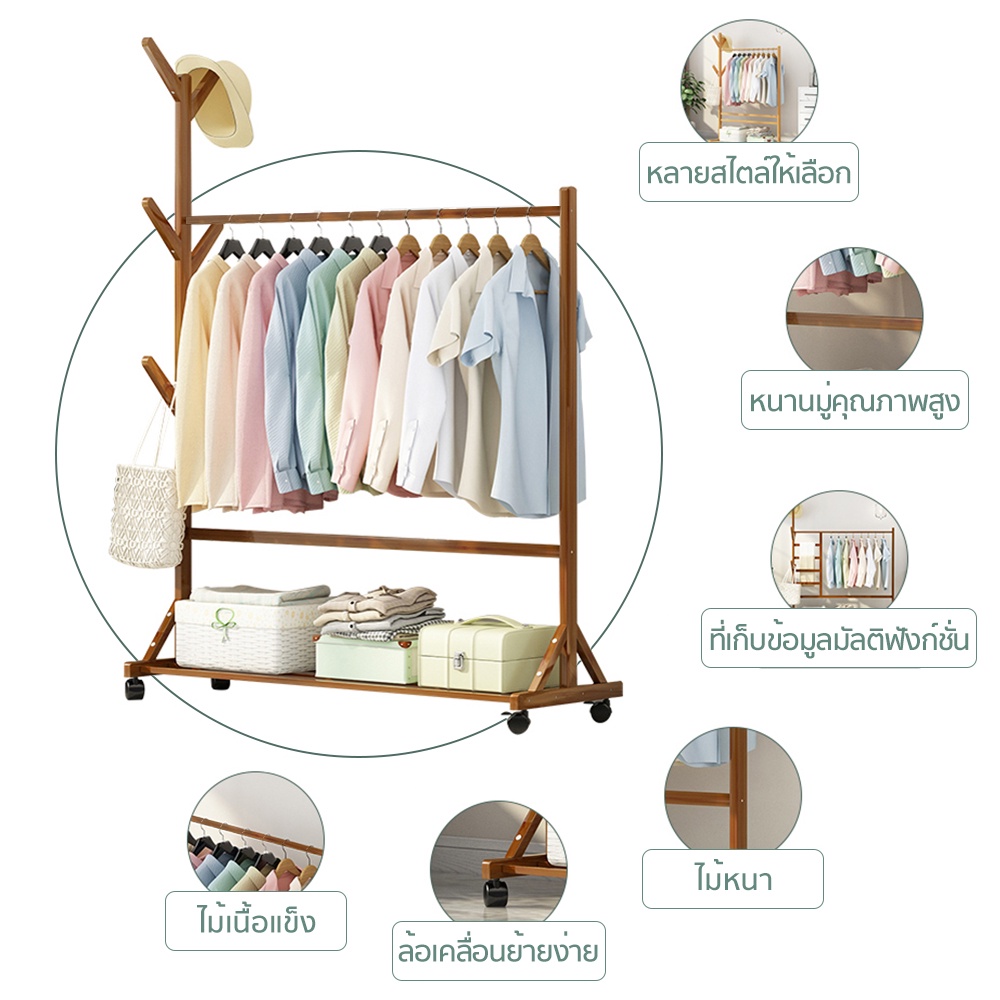 ราวไม้แขวนเสื้อผ้า แขวนผ้า ที่แขวนอเนกประสงค์ ชั้นวางเสื้อผ้าไม้ไผ่ มีล้อเลื่อนได้ เคลื่อนย้ายสะดวก