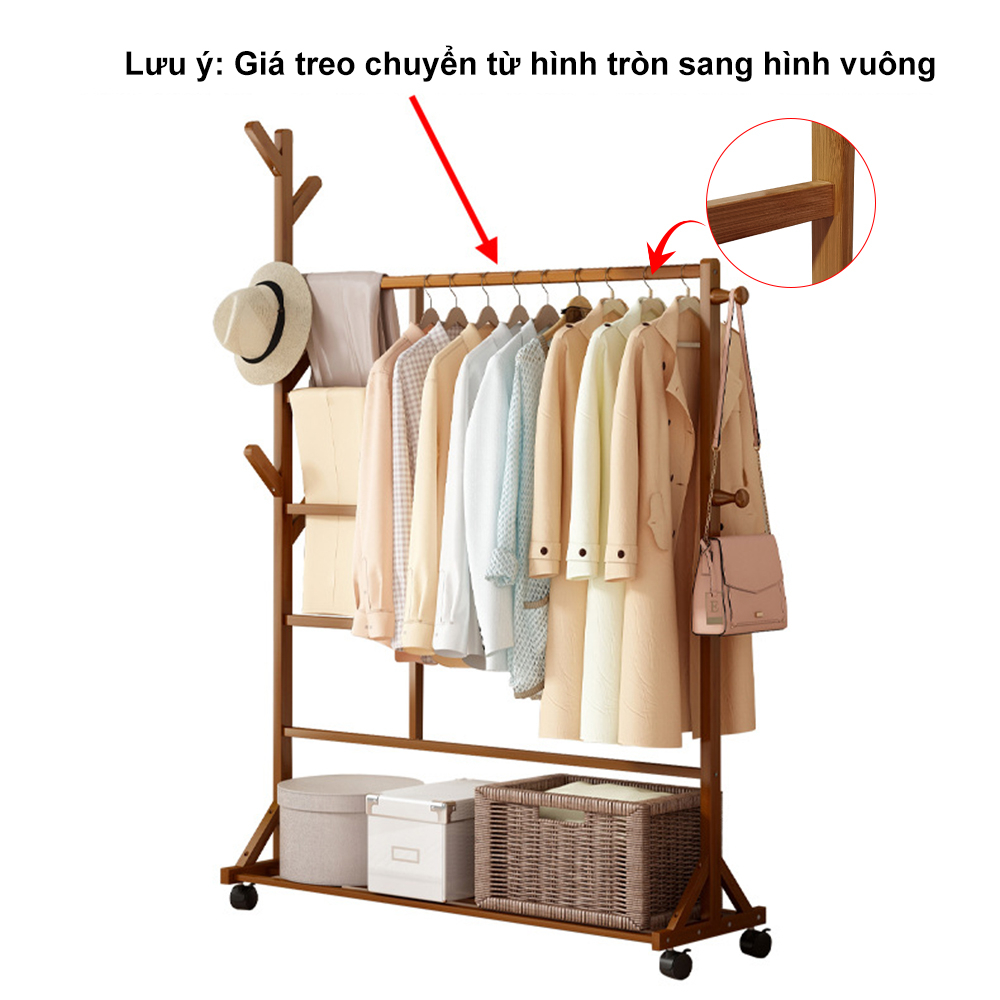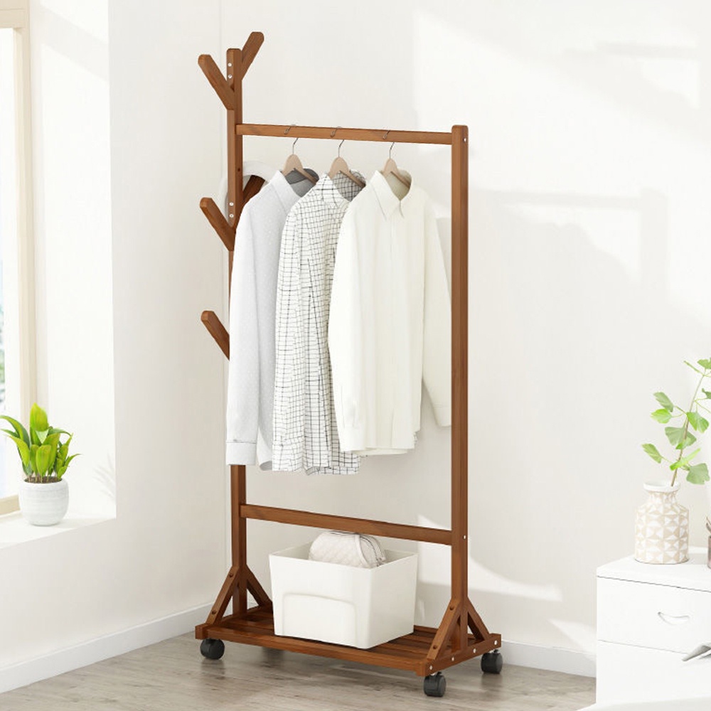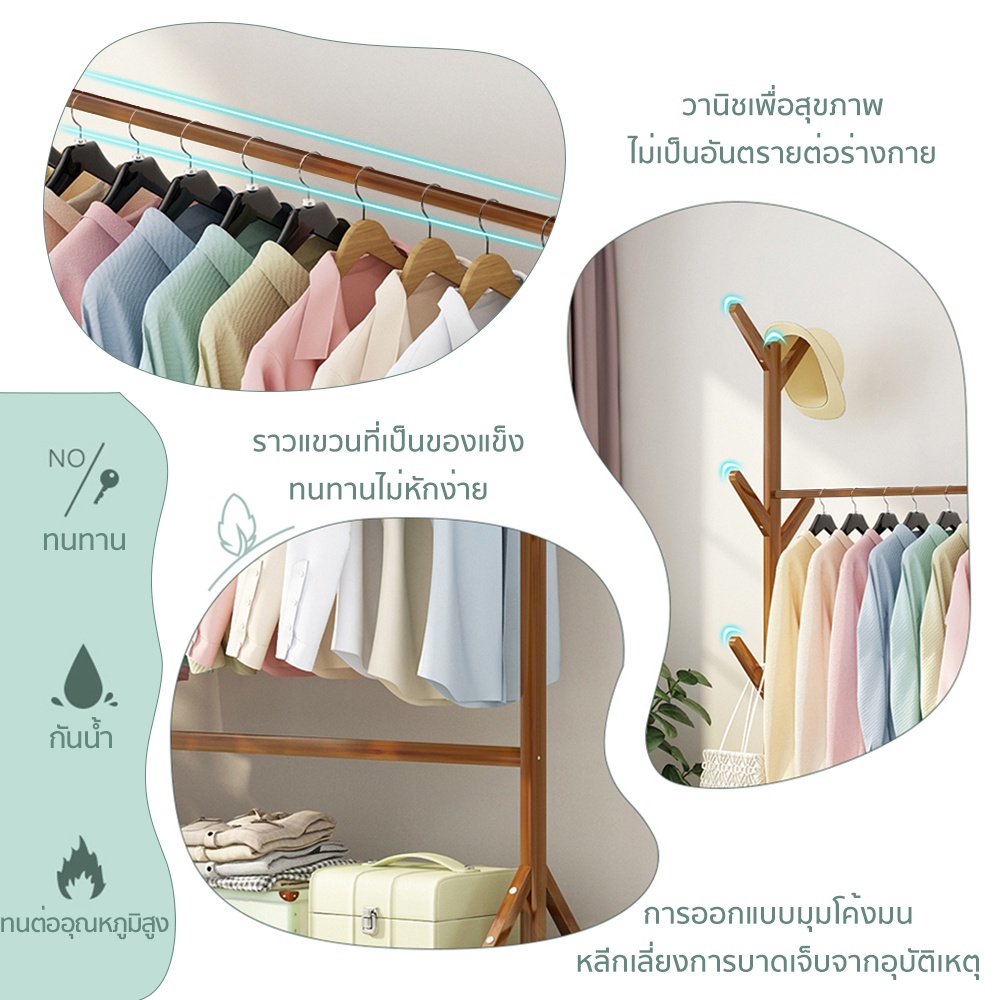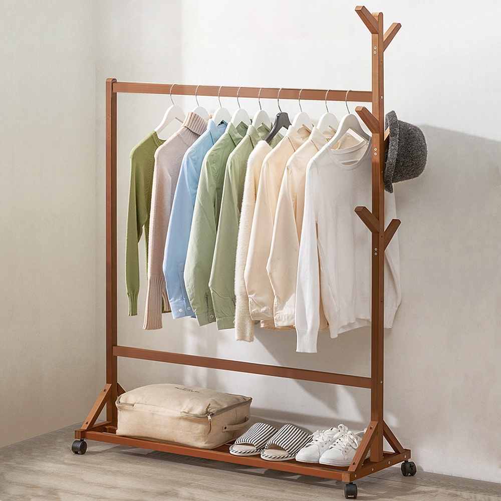 ราวไม้แขวนเสื้อผ้า แขวนผ้า ที่แขวนอเนกประสงค์ ชั้นวางเสื้อผ้าไม้ไผ่ มีล้อเลื่อนได้ เคลื่อนย้ายสะดวก