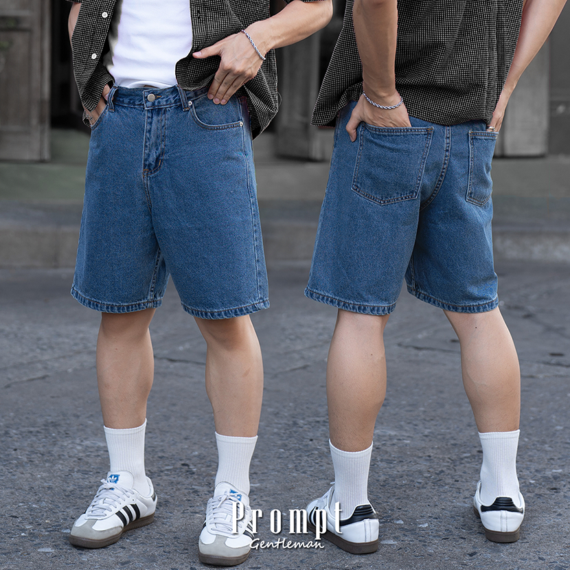 กางเกงยีนส์ขาสั้นผู้ชาย Prompt Baggy Bermuda ขากว้าง ไม่บาน สียีนส์ฟอกกลาง เอว28-36" ยีนส์ขาสั้น