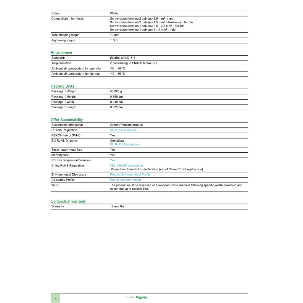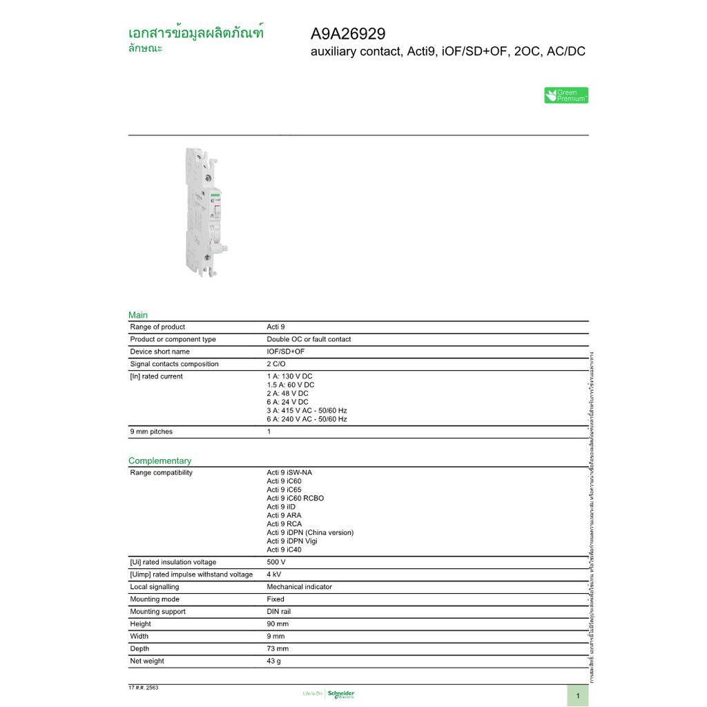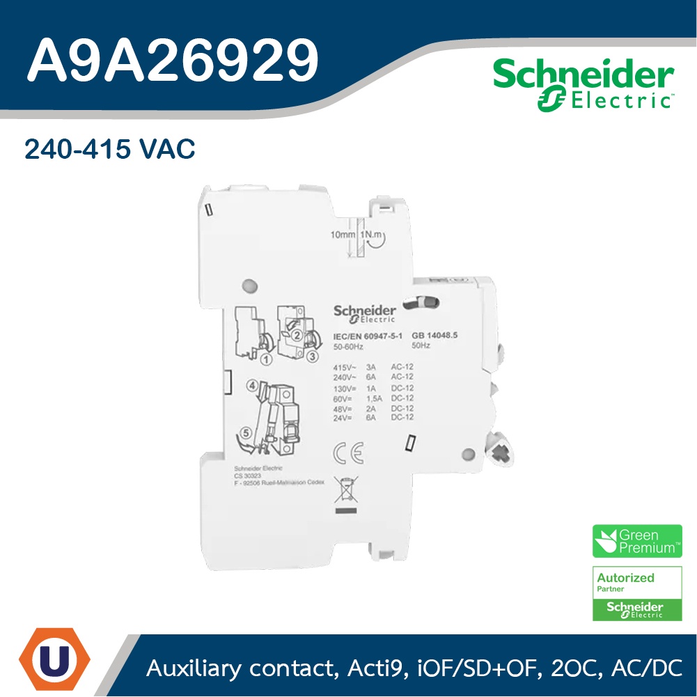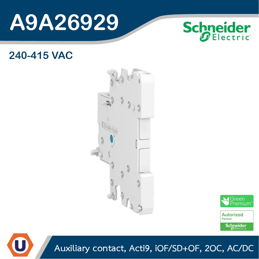 Schneider A9A26929 ขยายช่องสัญญาณการทำงานลูกย่อยและตัดการทำงาน 2 ช่อง Auxiliary contact, Acti9, iOF/SD+OF, 2OC, AC/DC