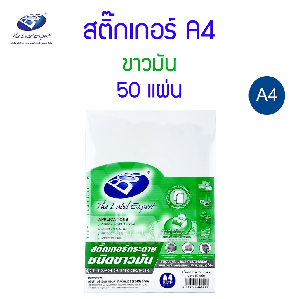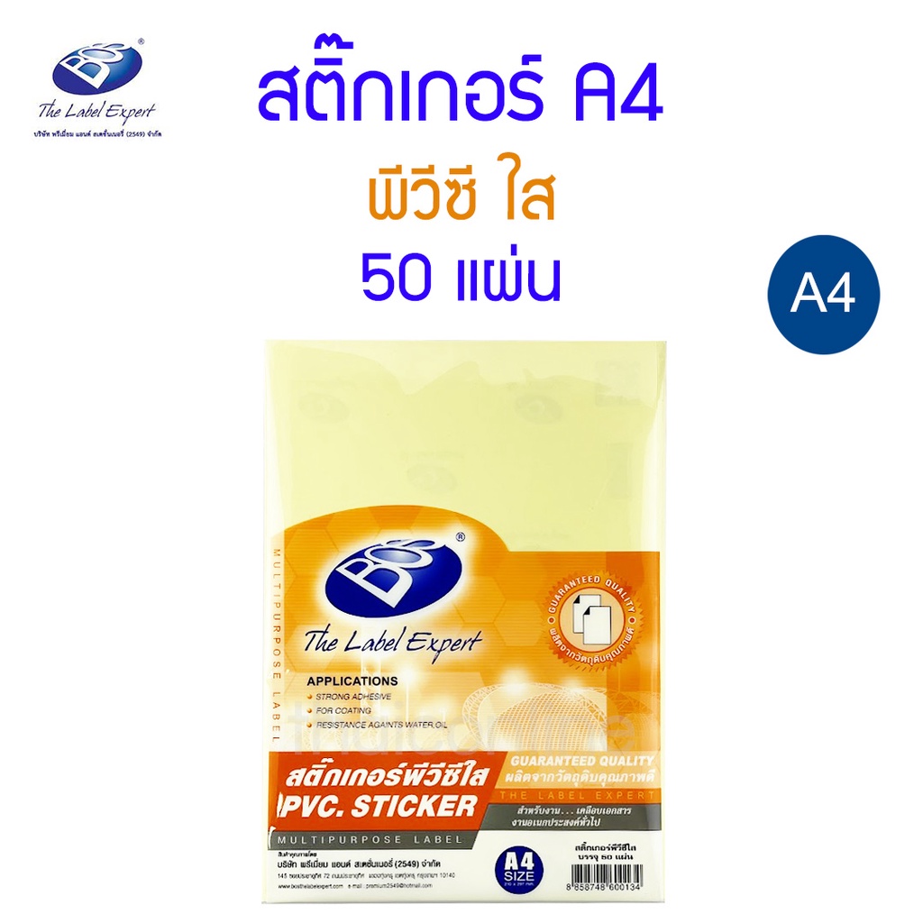 **ขายดีมาก** สติ๊กเกอร์ A4 กระดาษขาวด้าน กระดาษขาวมัน PVC ใส BOS 50 แผ่น