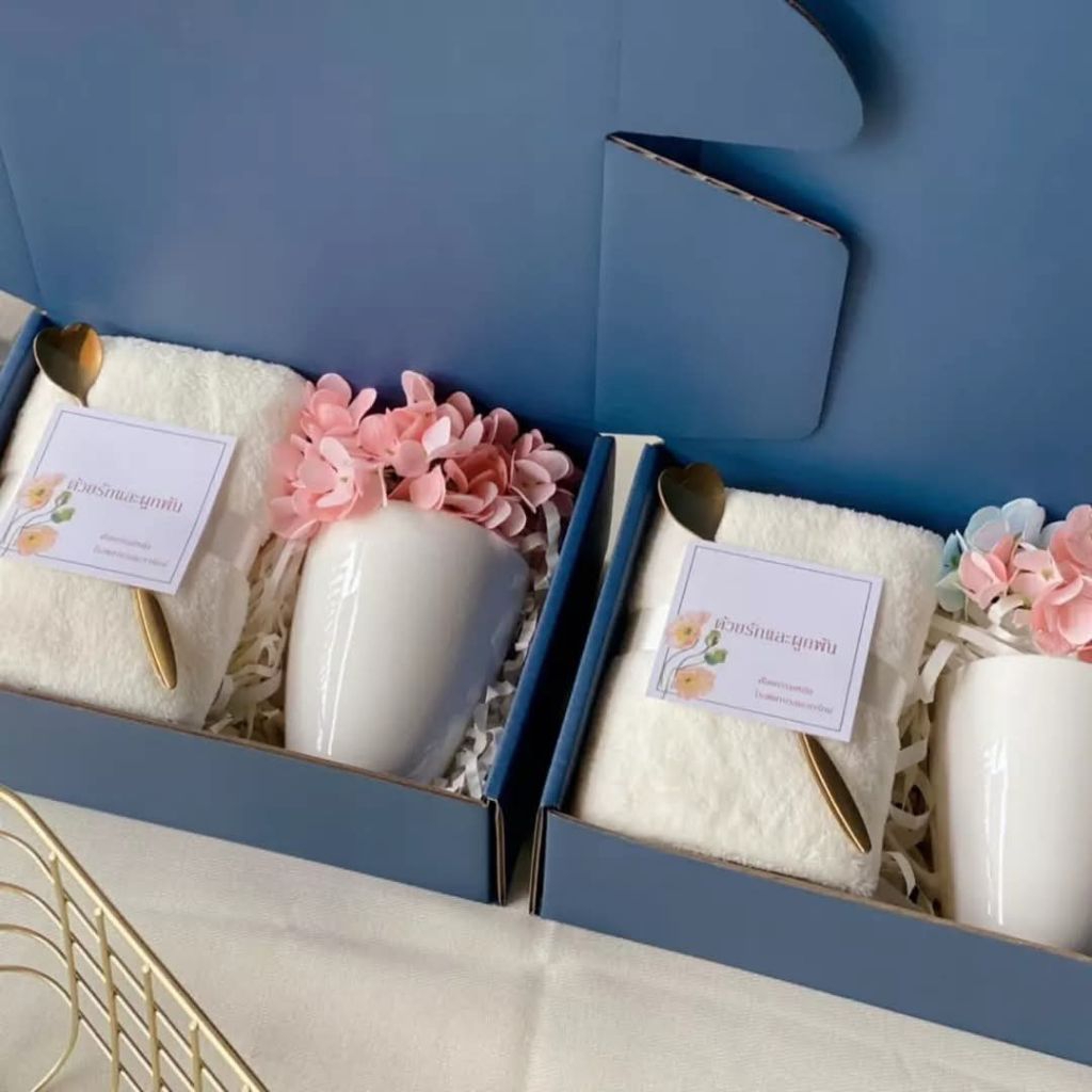 ของรับไหว้หรือของขวัญ แก้วมัค+ผ้าเช็ดผมนาโนพร้อมช้อนแสตนเลสหัวใจ