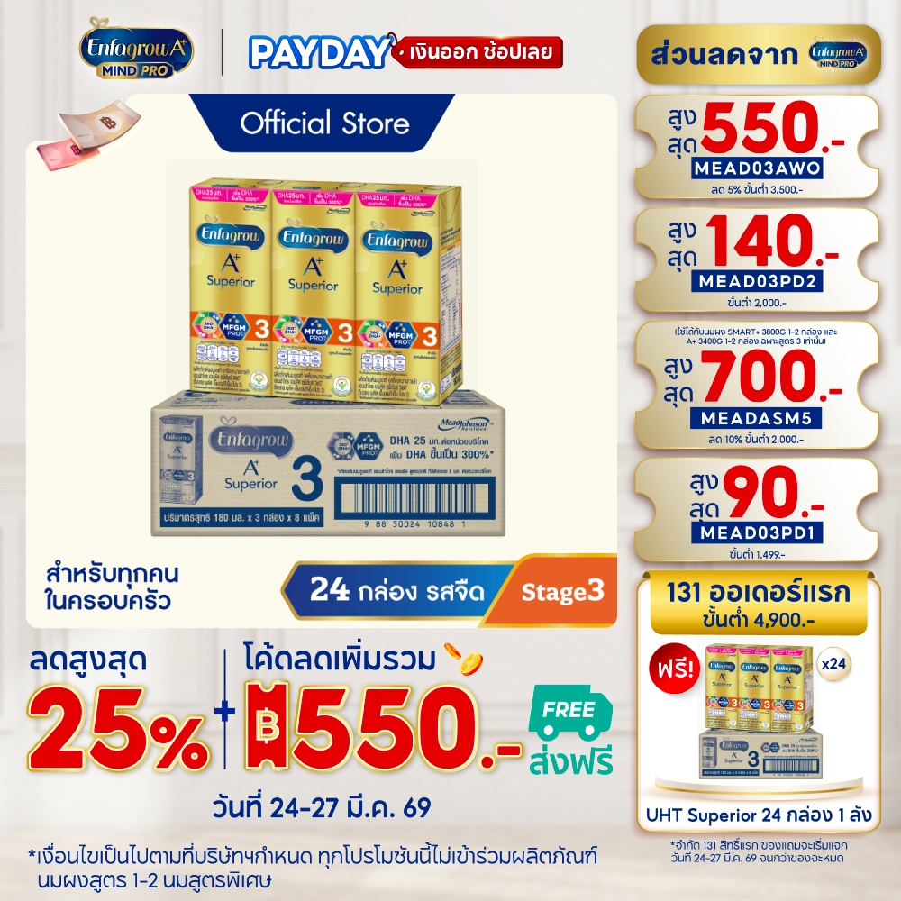 นมกล่อง เอนฟาโกร ยูเอชที ซุพีเรียร์ สูตร3 (24 กล่อง) Enfagrow UHT Superior Stage3 (24 boxes)