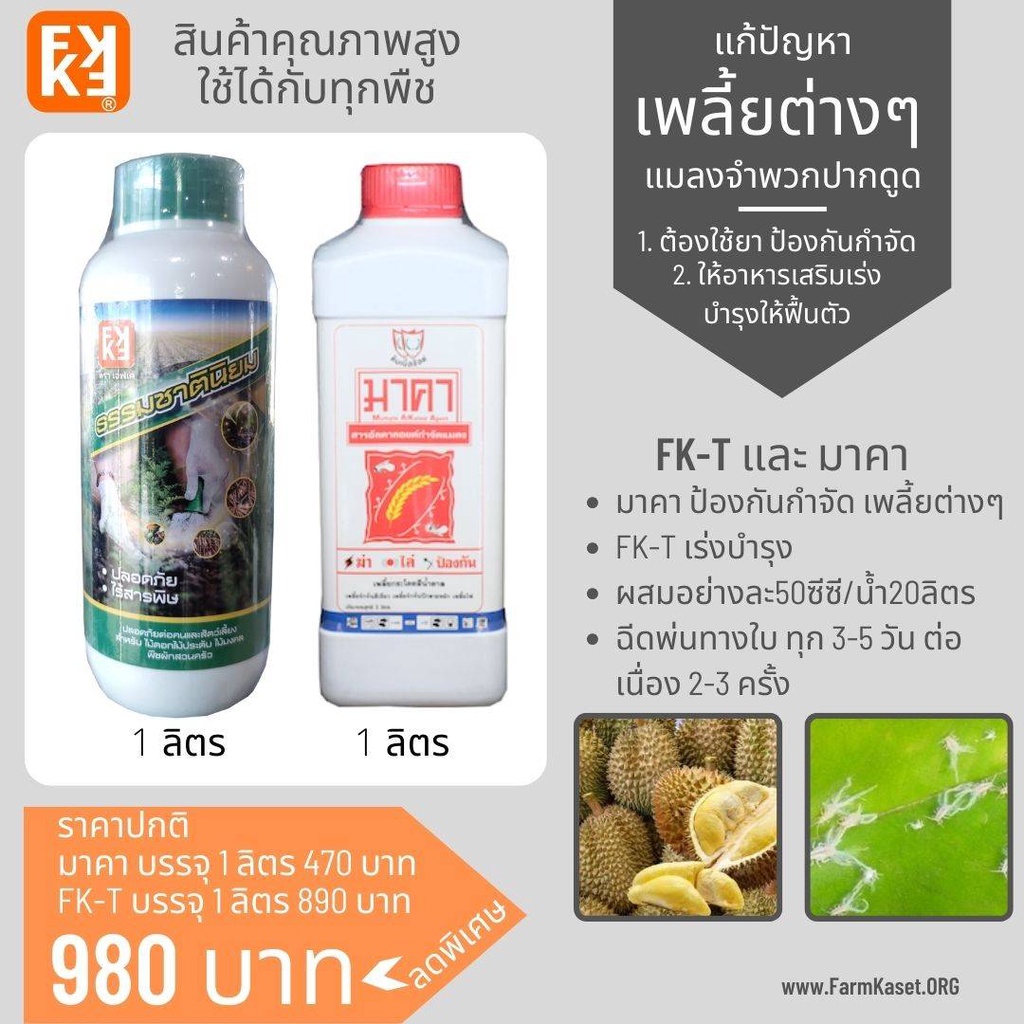 เพลี้ยไก่แจ้ทุเรียน เพลี้ยต่างๆ ในทุเรียน และพืชอื่นๆ มาคา และ FK-T (ใช้ได้ทุกพืช) โดย FK