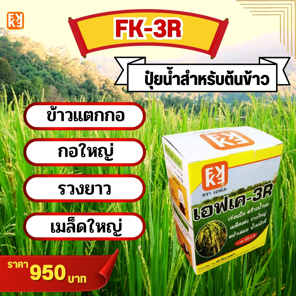 ปุ๋ย FK-3R สำหรับเพิ่มผลผลิต นาข้าว ต้นข้าว แตกกอดี รวงใหญ่ เมล็ดเต็ม เร่งสร้างน้ำนม น้ำหนักดี ผลผลิตดี(ฉีดรับรวง)โดย FK
