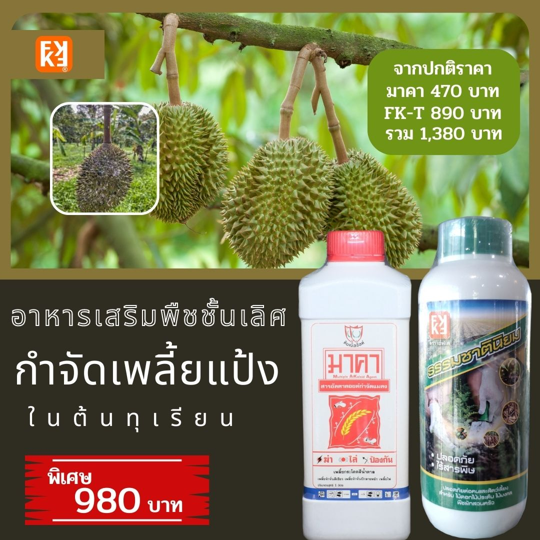 กำจัดเพลี้ยไฟ ศัตรูพืชในต้นทุเรียน มาคา ฟื้นฟูจากการเข้าทำลายของเพลี้ย FK-T อาหารเสริมพืชชั้นเลิศ โดย FK