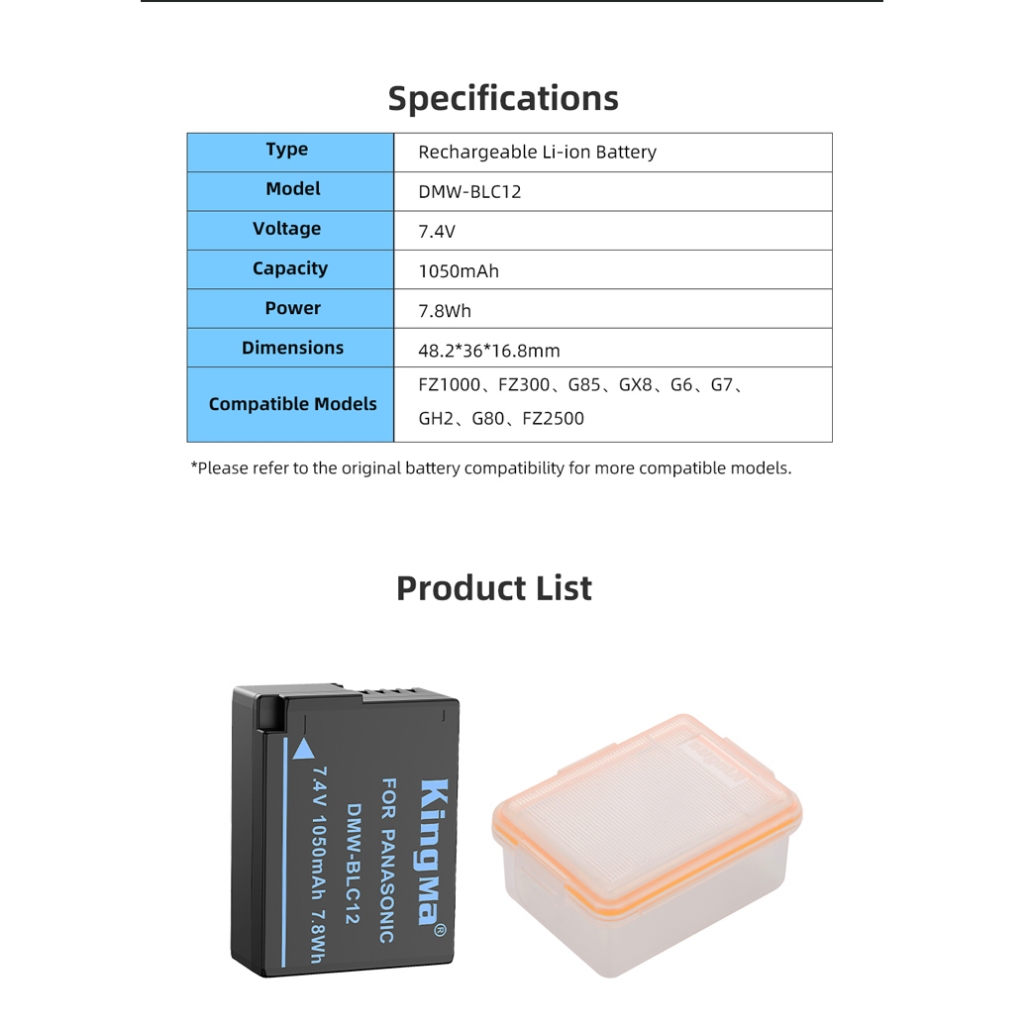 KingMa แบตเตอรี่ DMW-BLC12 กล้อง Pana Lumix DMC GX8 G95 G85 GH2 G6 BP-DC12 Leica Q Leica BP-DC12