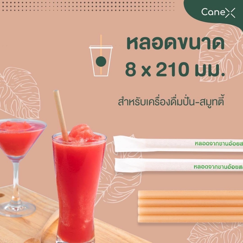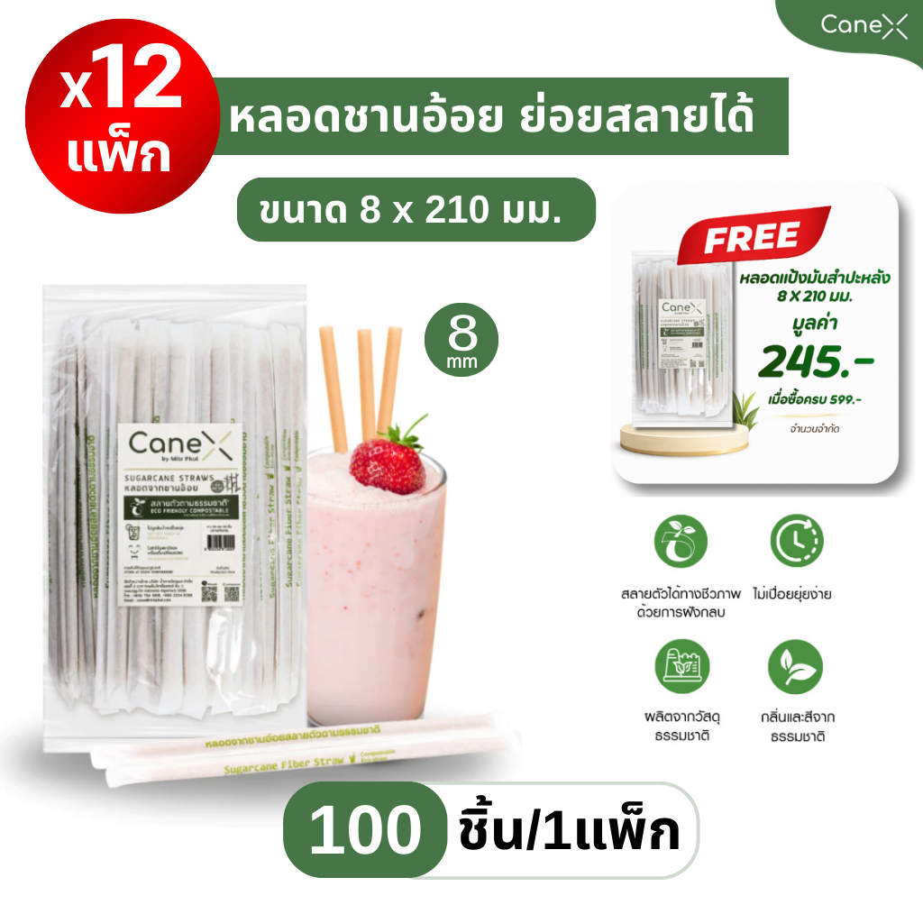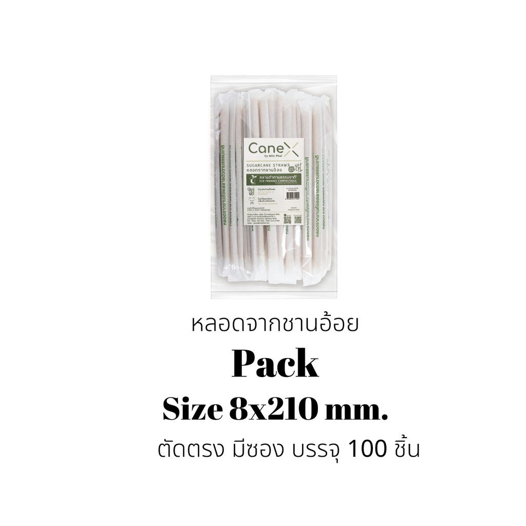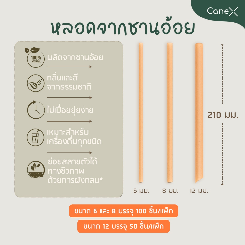 (1200 ชิ้น) CaneX หลอดชานอ้อย ย่อยสลายได้ 100% แพ็กละ 100 ชิ้น ขนาด 8 x 210 มม. ตัดตรง หลอดไบโอ หลอดรักษ์โลก Bio straw