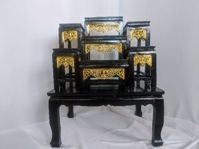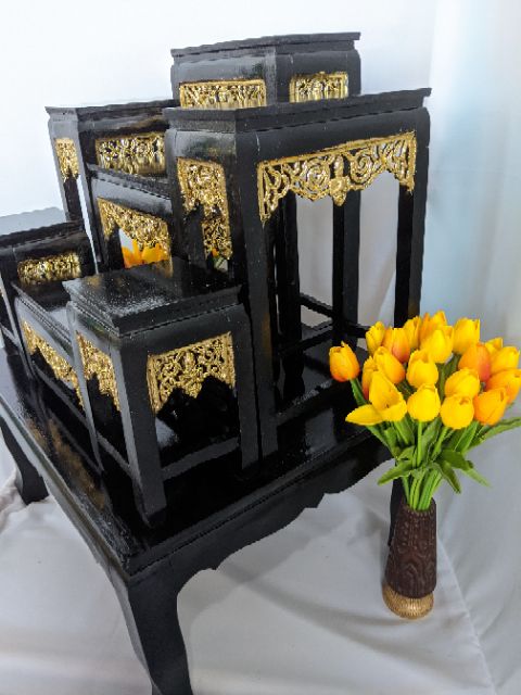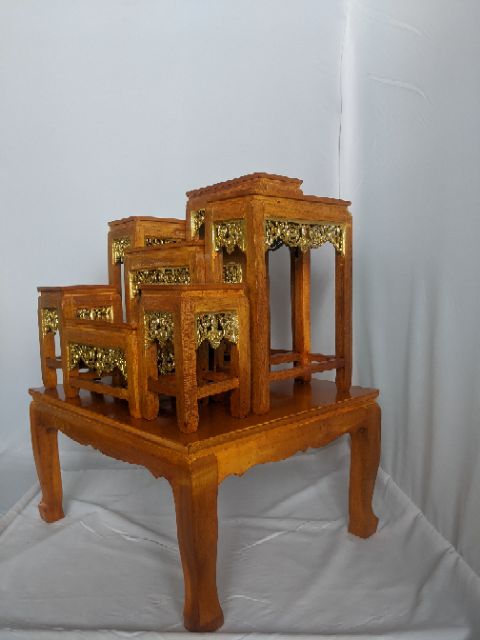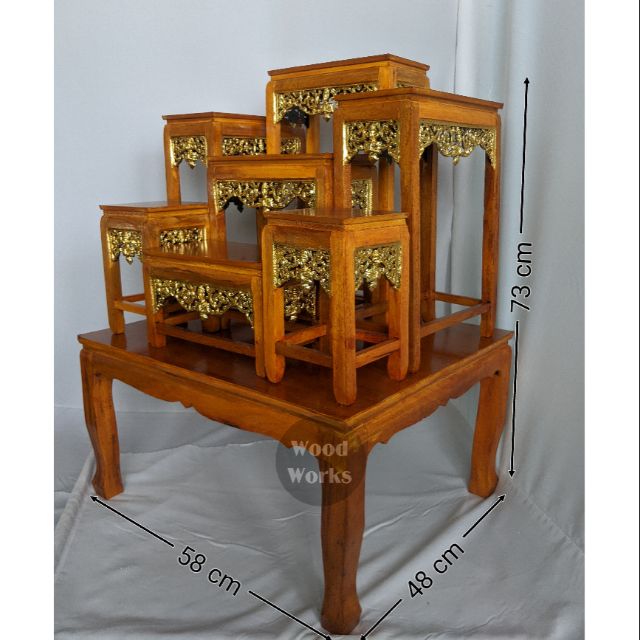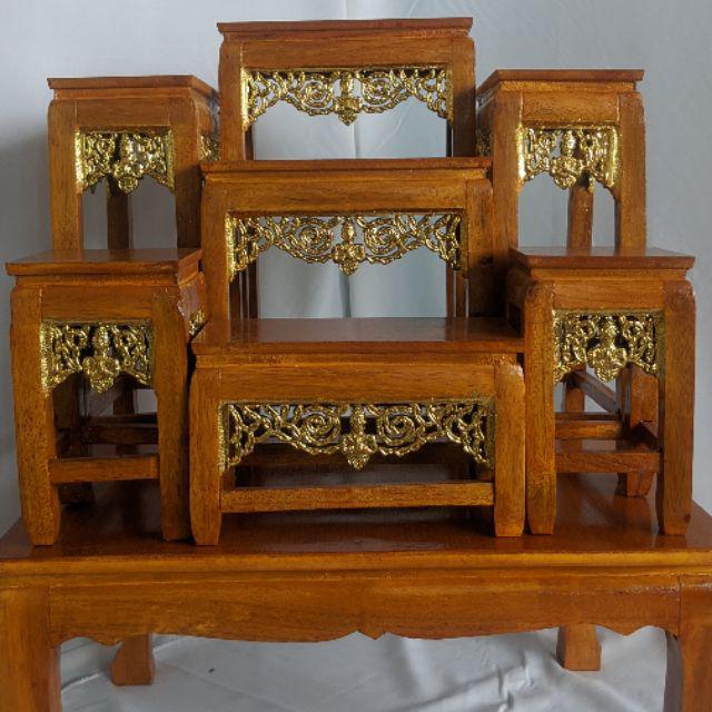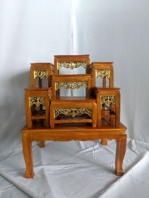 โต๊ะหมู่บูชาพระ หน้า 5 หมู่7 สีเหลืองลายไม้ กระจังทองปิด ราคาถูกที่สุดในช้อปปี้