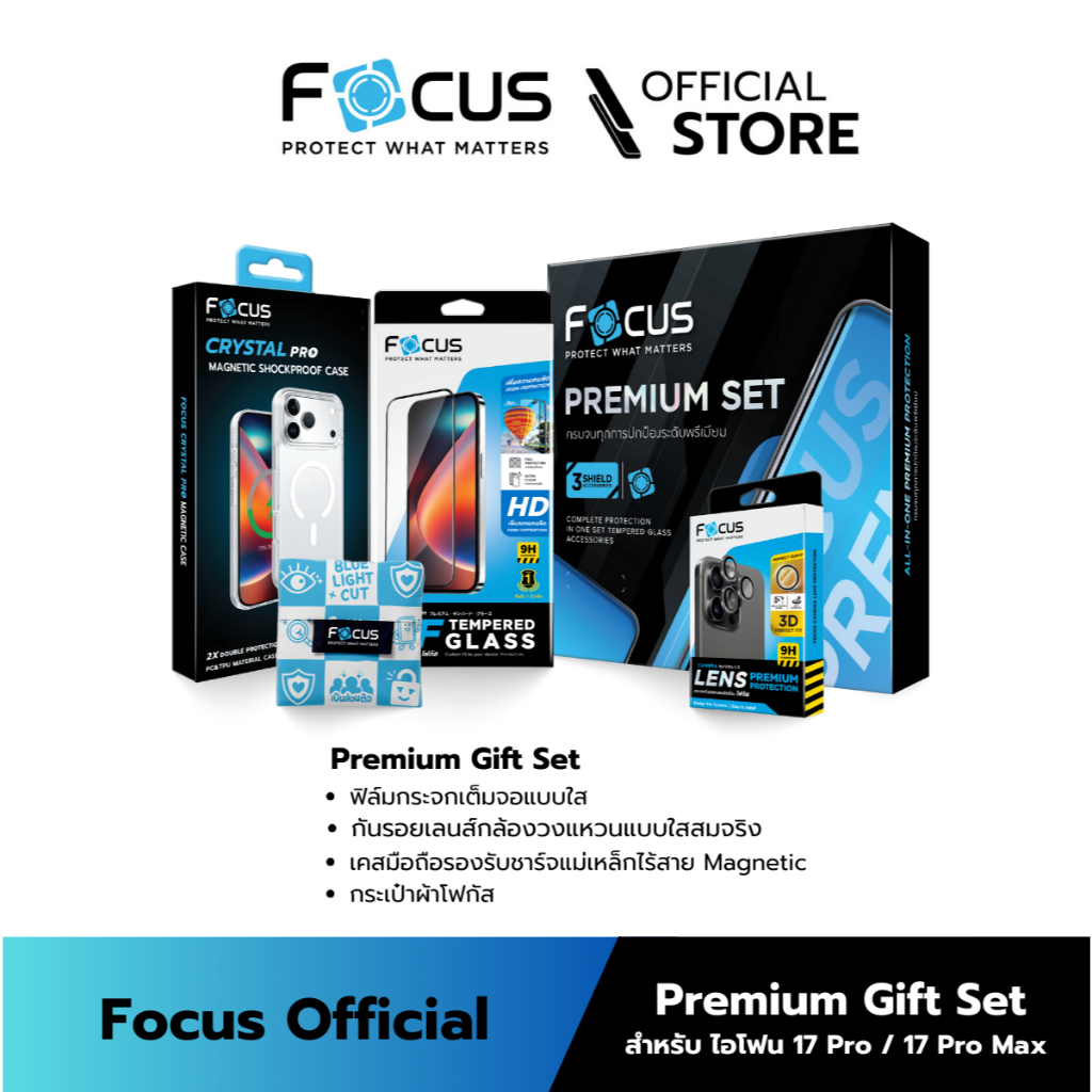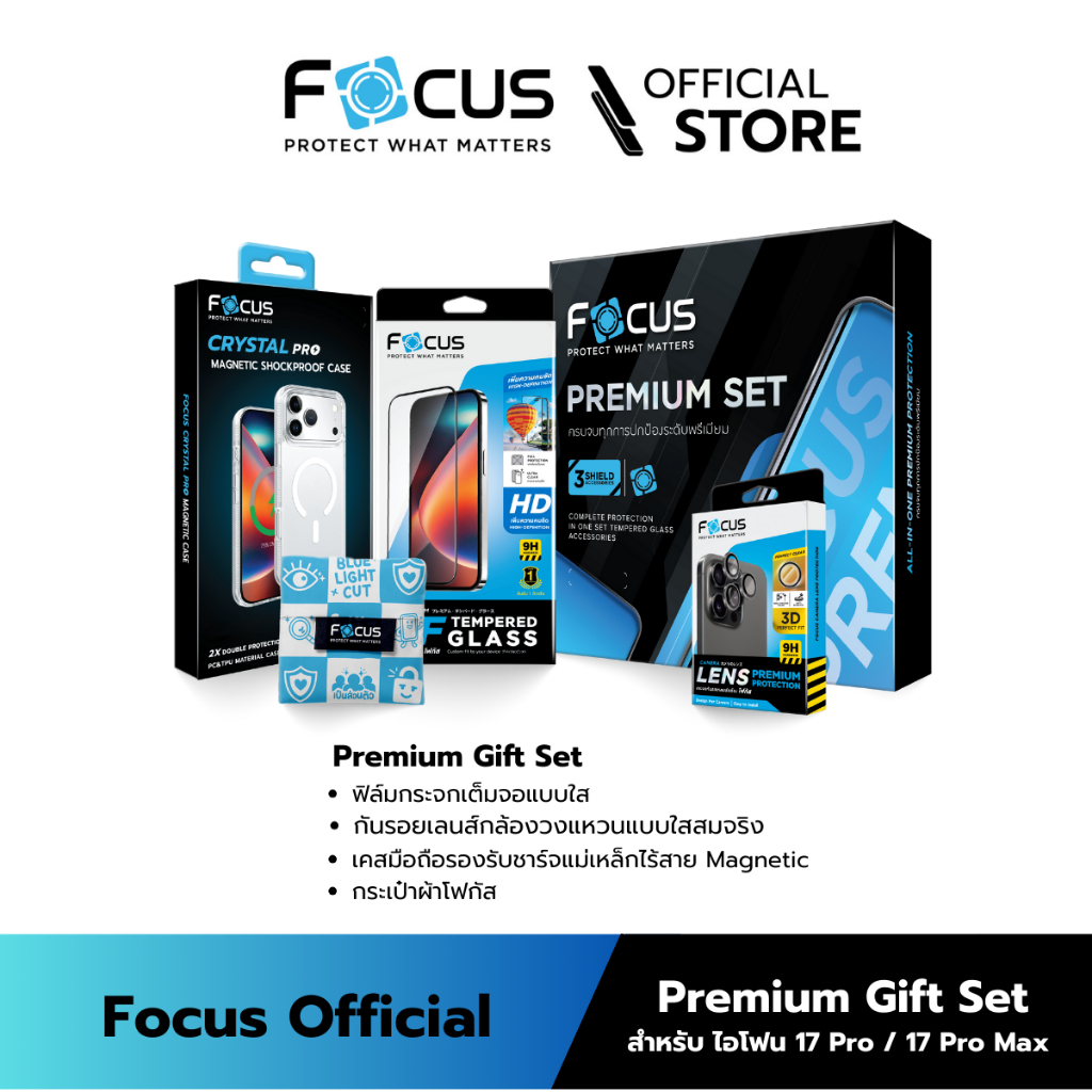 [Official][ไอโฟน 17 Pro / 17 Pro Max] Focus Box Set - เซ็ตฟิล์มกระจกเต็มจอใส FF HD วงแหวนเลนส์กล้องใส และเคส Magnetic