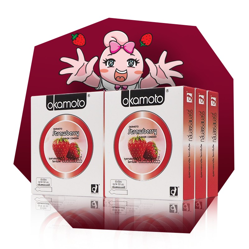 Okamoto Strawberry ถุงยางอนามัย กลิ่นสตรอเบอร์รี่ ผิวเรียบ ขนาด 53 มม. บรรจุ 6 กล่อง (12 ชิ้น)