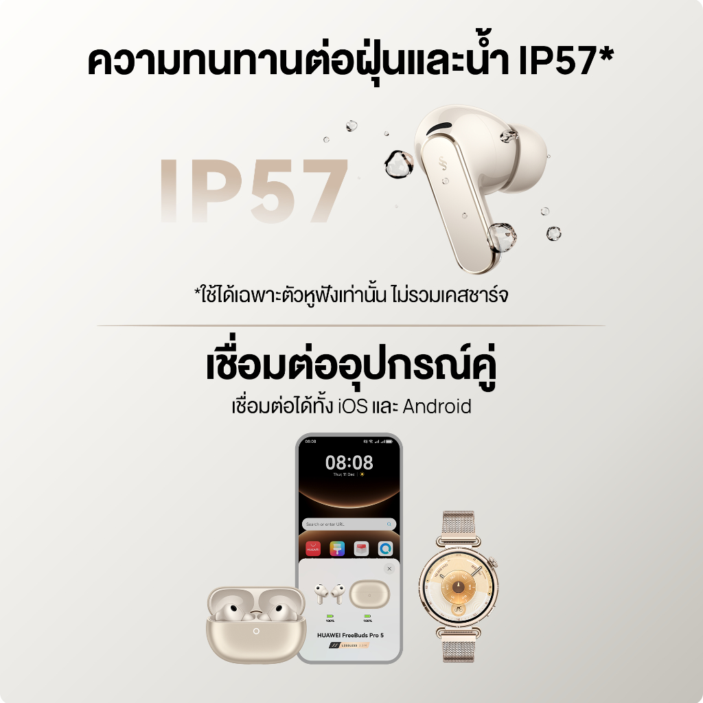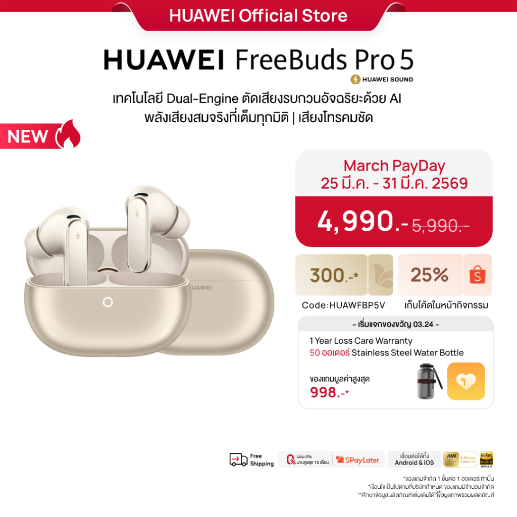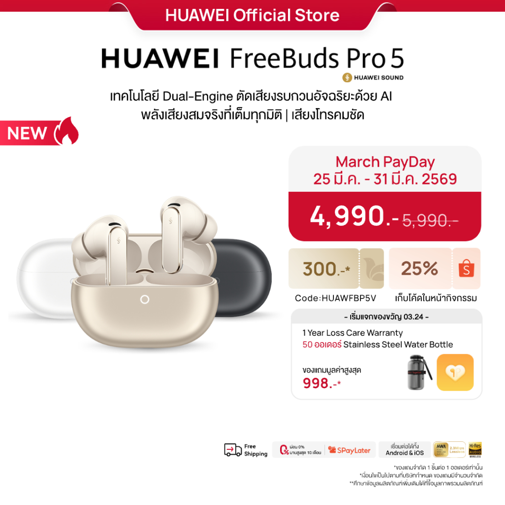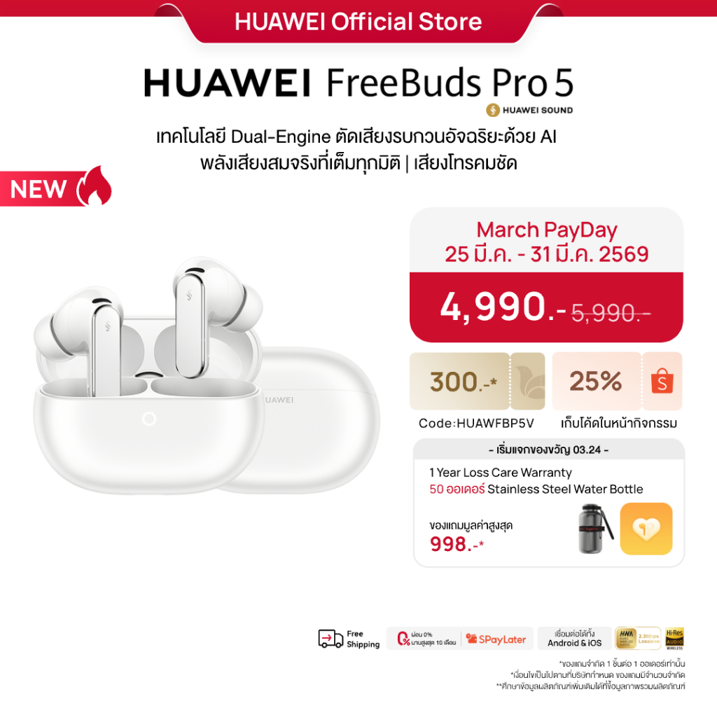 [ 3.25 | โค้ดลด 25%.-] HUAWEI FreeBuds Pro 5 l หูฟัง l เทคโนโลยี Dual-Engine ตัดเสียงรบกวนอัจฉริยะด้วย AI