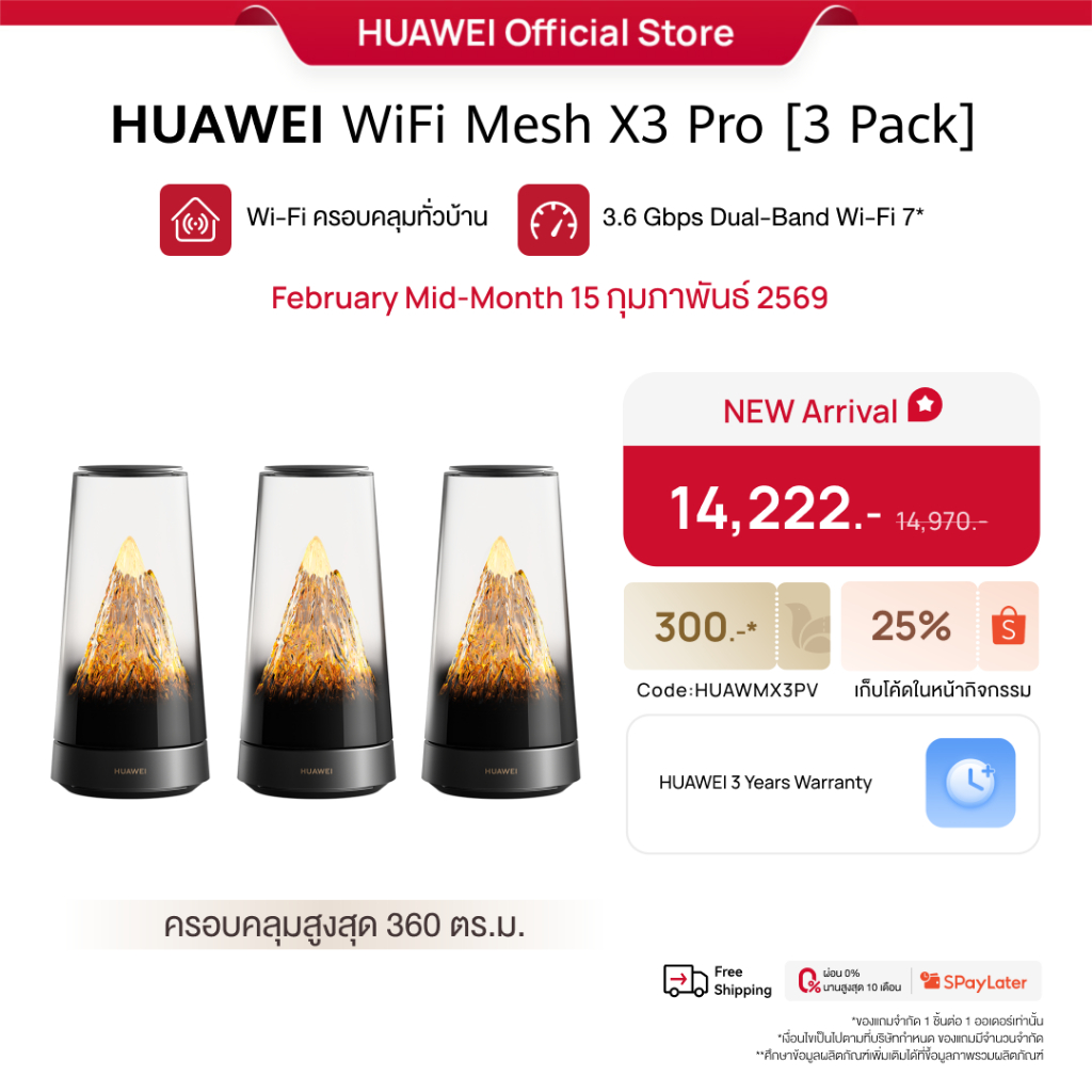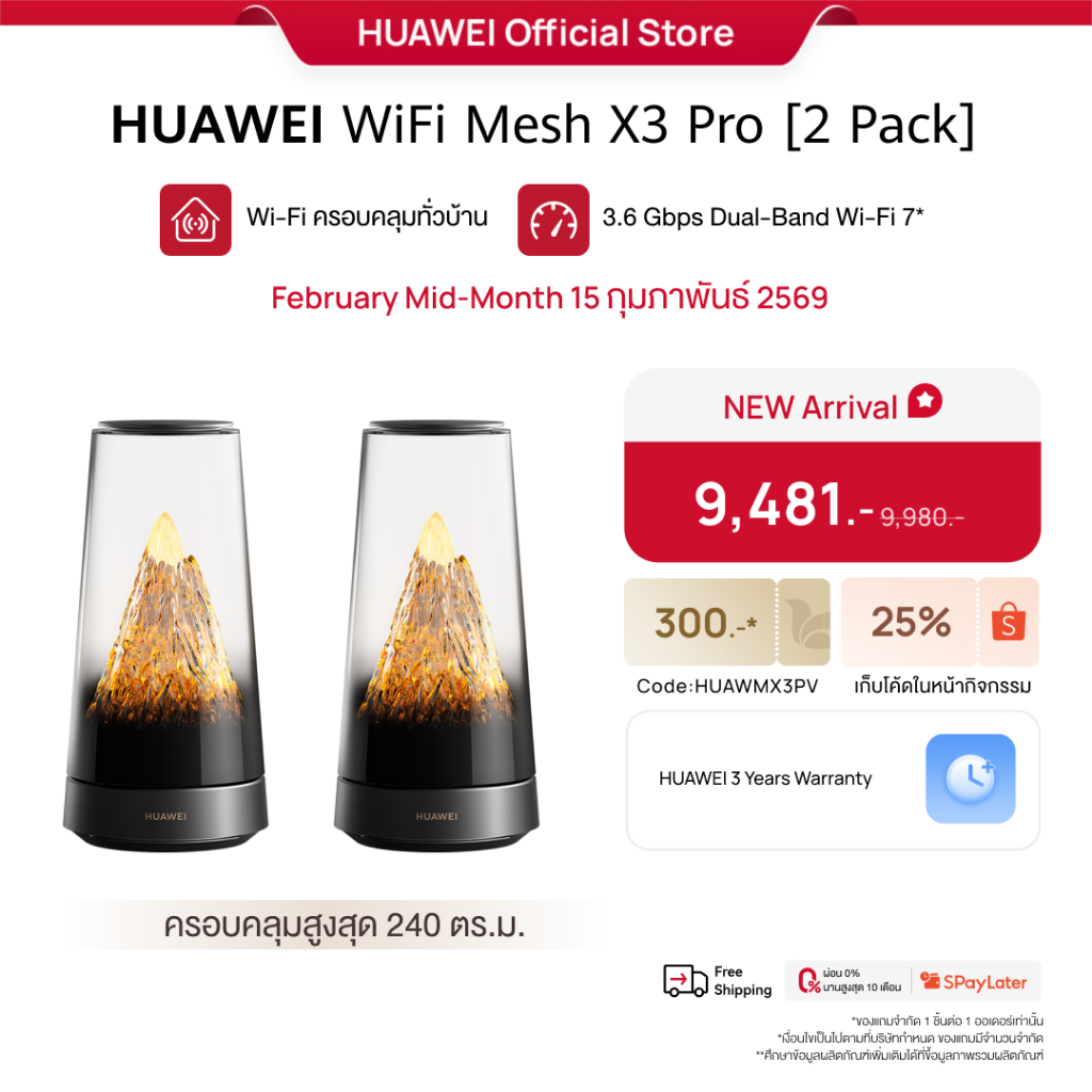 [2.15 | โค้ดลด 25%] HUAWEI WiFi Mesh X3 Pro Series | เราเตอร์ | Wi-Fi ครอบคลุมทั่วบ้าน | 3.6 Gbps Dual-Band Wi-Fi 7
