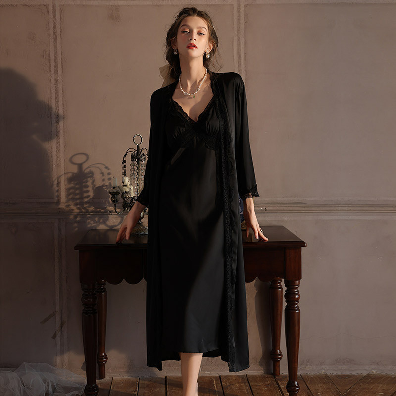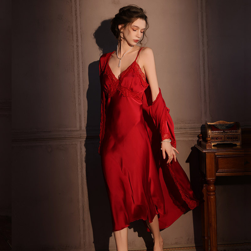 ชุดเสื้อคลุมเซ็กซี่สำหรับผู้หญิง ชุดนอนสองชิ้นจากผ้าไหมน้ำแข็งและลูกไม้ ใส่เป็นชุดลำลองได้