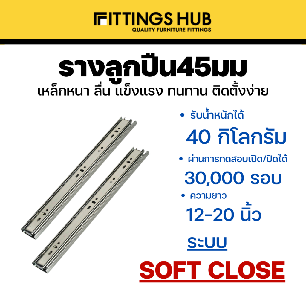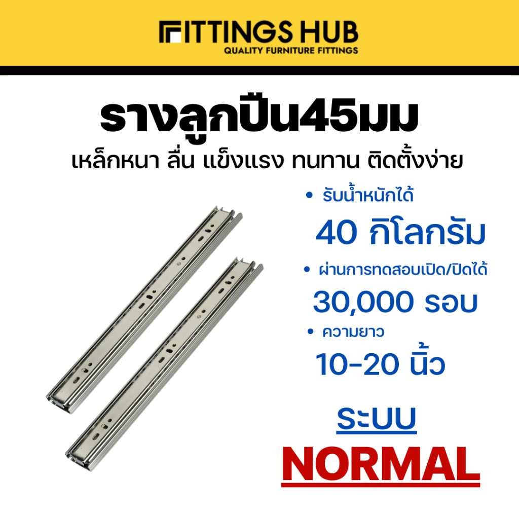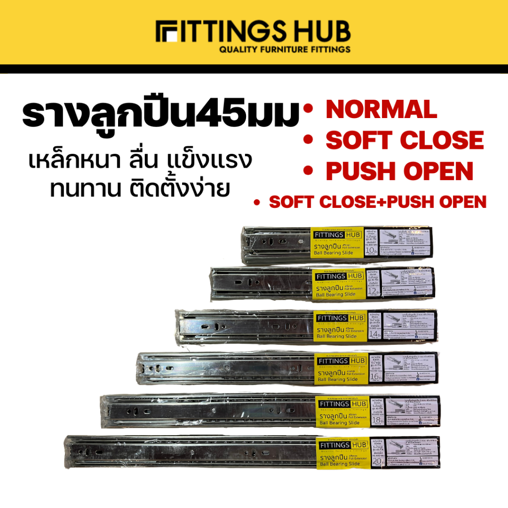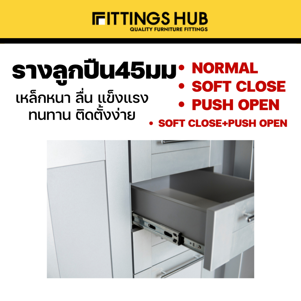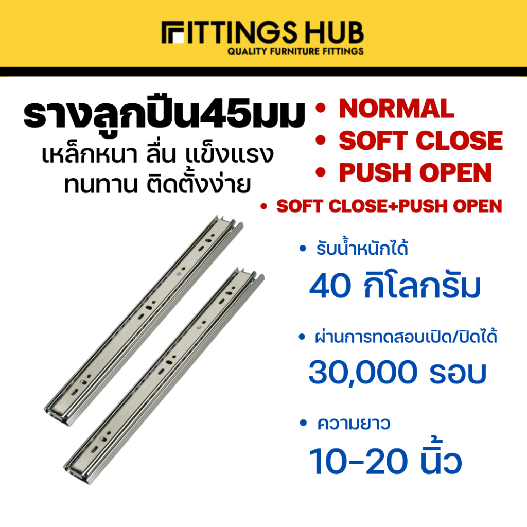 รางลิ้นชักลูกปืน 45มม ธรรมดา/Soft close/Push open พร้อมสกรู แข็งแรง ทนทาน FittingsHub