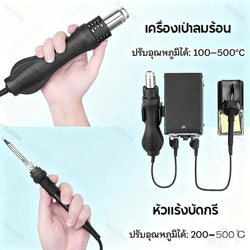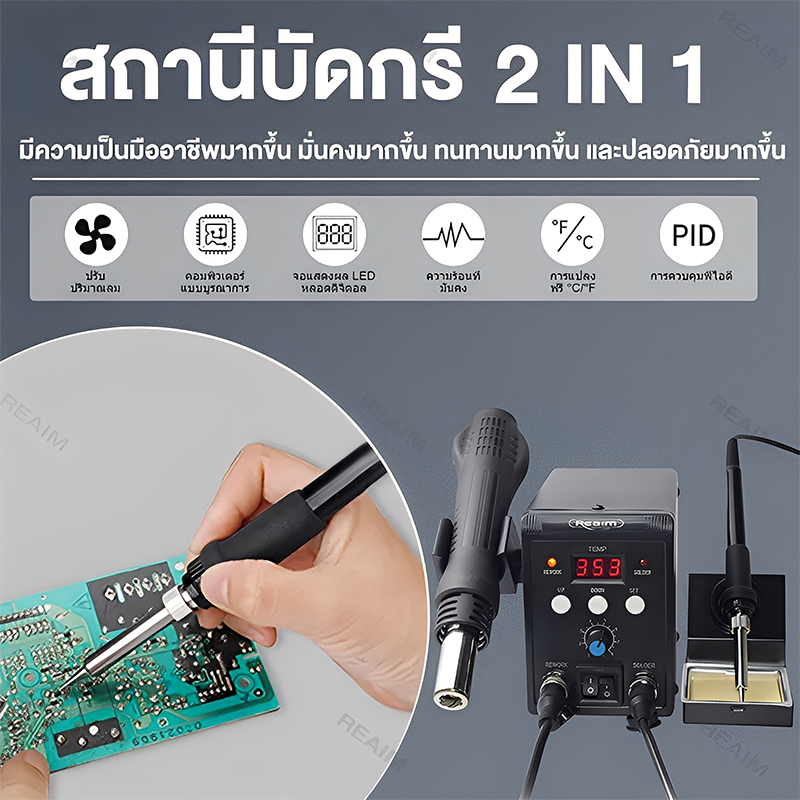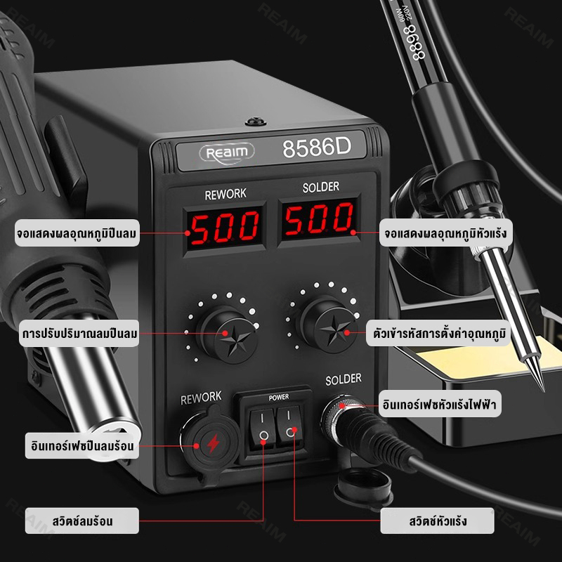 REAIM เครื่องเป่าลมร้อน 8586D ปืนลมร้อนสถานีบัดกรี หัวแร้งฮอตแอร์ 2IN1 ซ่อมเครื่องเชื่อม
