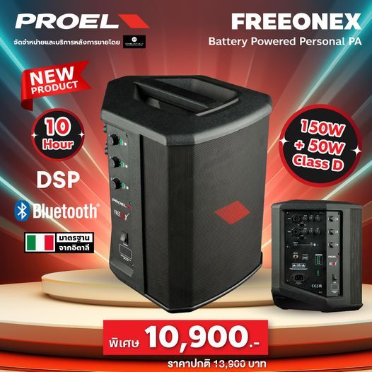 ลำโพง Proel รุ่น FreeOneX All-In-One แบบพกพา มีแบตเตอรี่ในตัว ใช้งานได้นาน 10 ชั่วโมง มิกเซอร์ 3 ชาแนล