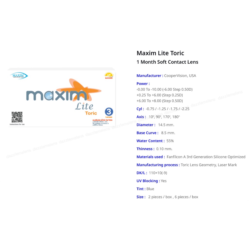 Maxim Lite Toric คอนแทคเลนส์รายเดือนสายตาสั้นและเอียง (1 Box : 3 Pairs) (ค่าเอียง -0.75)