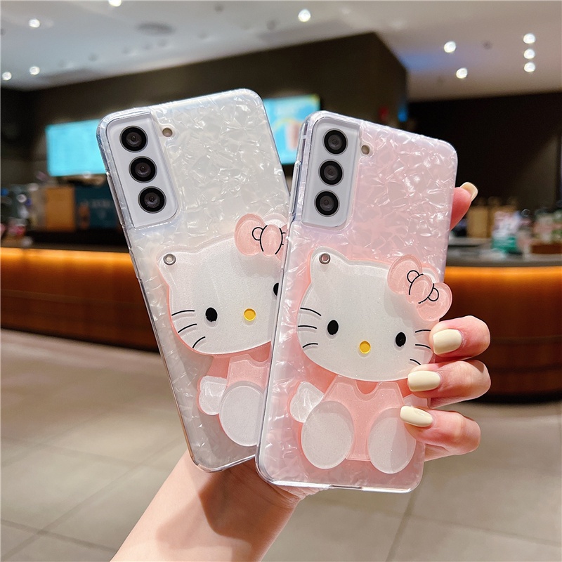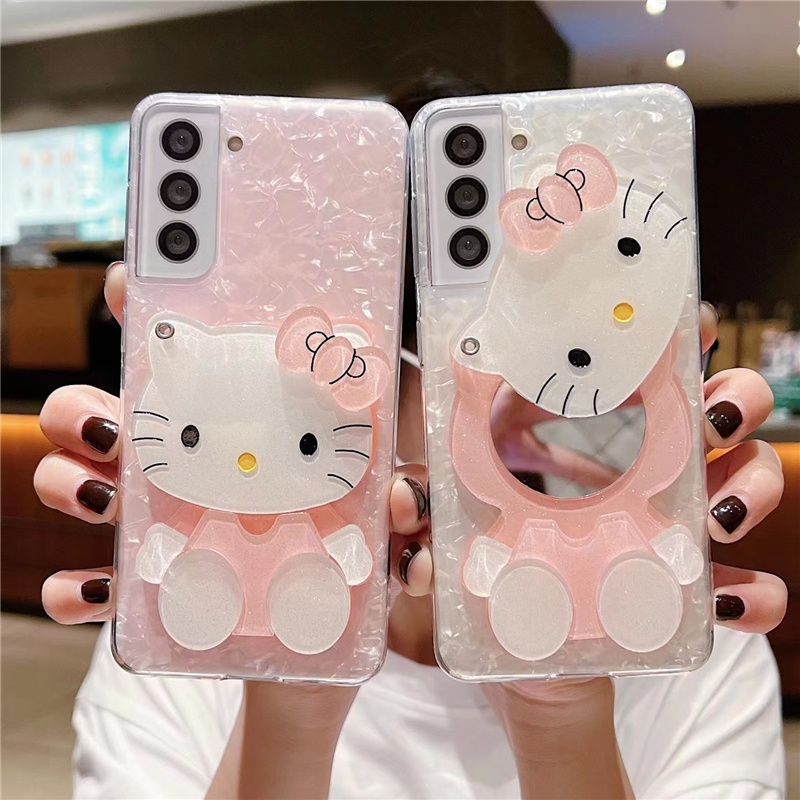 สําหรับ Samsung Galaxy S24 FE S24 Ultra S23 + 5G S22 + S23 FE S21 Plus S21 + เคสโทรศัพท์แฟชั่นใหม่เงาเชลล์กับ Kitty กระจกแต่งหน้าปลอก SamsungS23Ultra GalaxyS23 นุ่ม