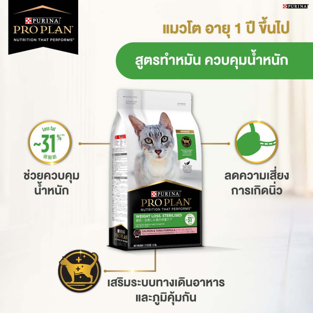 Proplan Weight Loss.Sterilized สำหรับแมวโตควบคุมน้ำหนัก/ทำหมัน สูตรปลาแซลมอนและทูน่า ขนาด 1.5 KG.