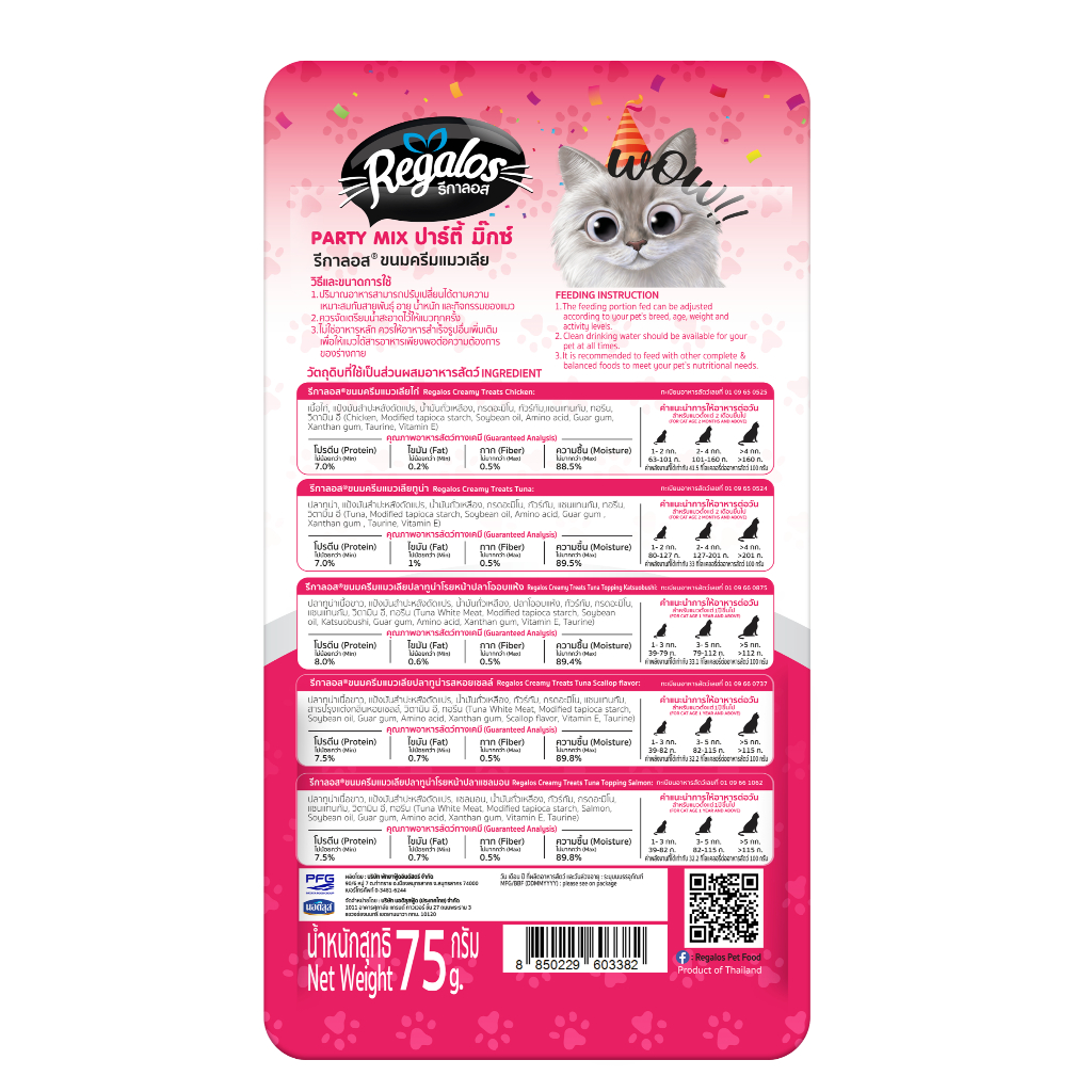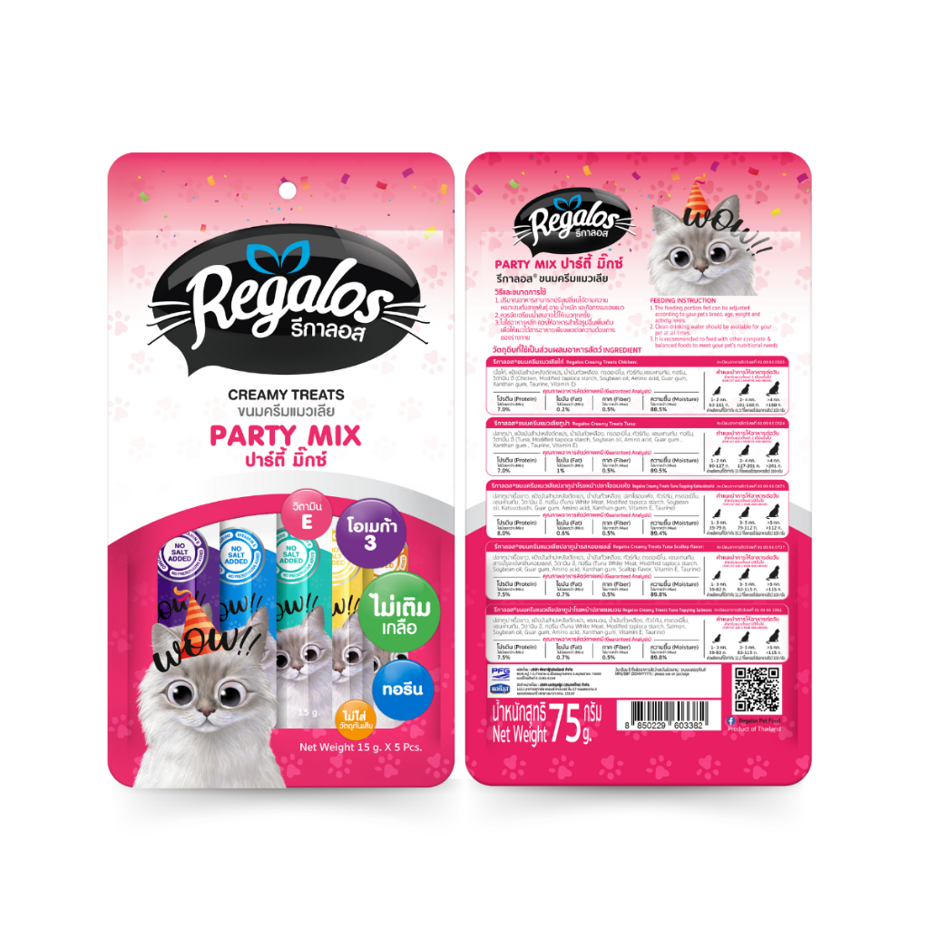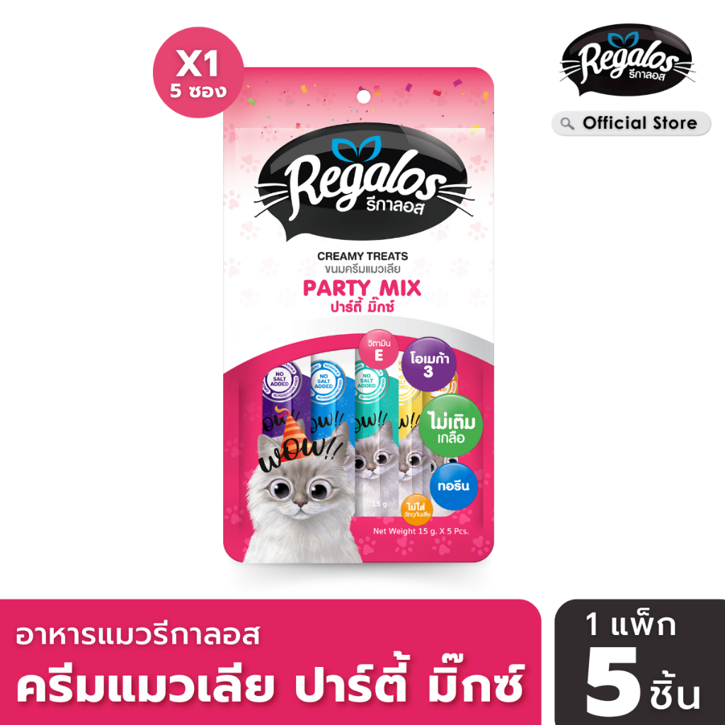 [ใหม่] รีกาลอส อาหารแมว ขนมแมวเลีย ปาร์ตี้ มิ๊กซ์ มิ๊กซ์ ความอร่อย ครบทุกรสชาติไว้ในซอง แพค 5 ชิ้น