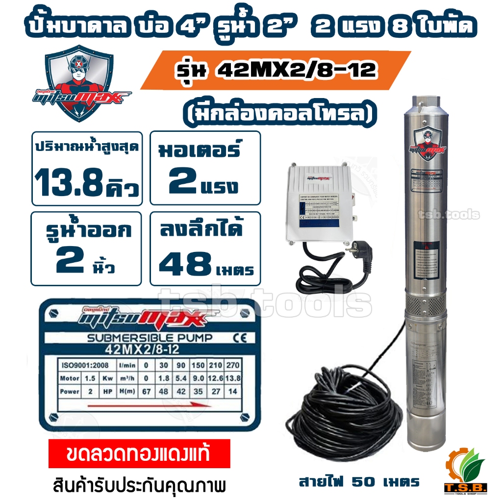MITSUMAX ปั๊มบาดาล ไฟฟ้า 2แรงม้า 220V รุ่น 42MX2/8-12 มีกล่องสตาร์ท บ่อ 4นิ้ว ท่อออก 2 นิ้ว 8 ใบพัด แถมฟรีสายไฟ 50 เมตร