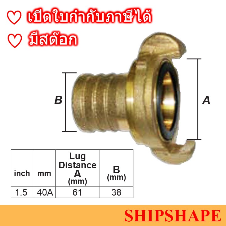ข้อต่อดับเพลิง ทองเหลือง Nakajima นากาจิม่า เสียบสาย ขนาด 40A(1.5") Lug distance (A) 61mm ออกใบกำกับภาษีได้ค่ะ