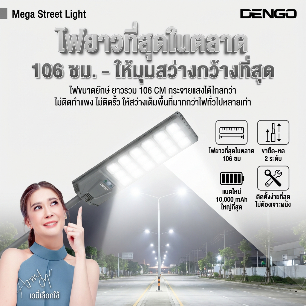 [ยาวที่สุด 106cm] Dengo Mega Street Light Solar ไฟถนนโซล่าเซลล์ โคมไฟถนน กันน้ำ แบตอึด สว่างกว้าง ประกัน 1 ปี