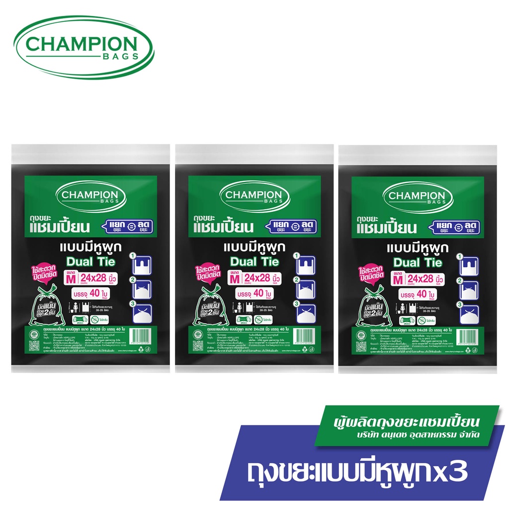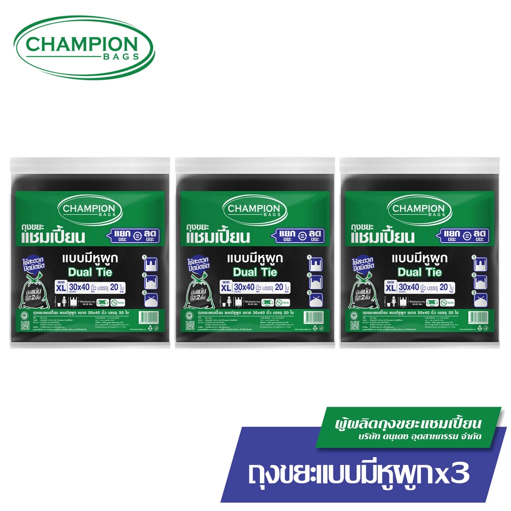 [สุดคุ้ม 3 แพ็ก]มีหูผูก หิ้วได้-Champion Bags ถุงขยะแชมเปี้ยน แบบหูผูก ปิดมิดชิดด้วยหูผูก 2 ชั้น