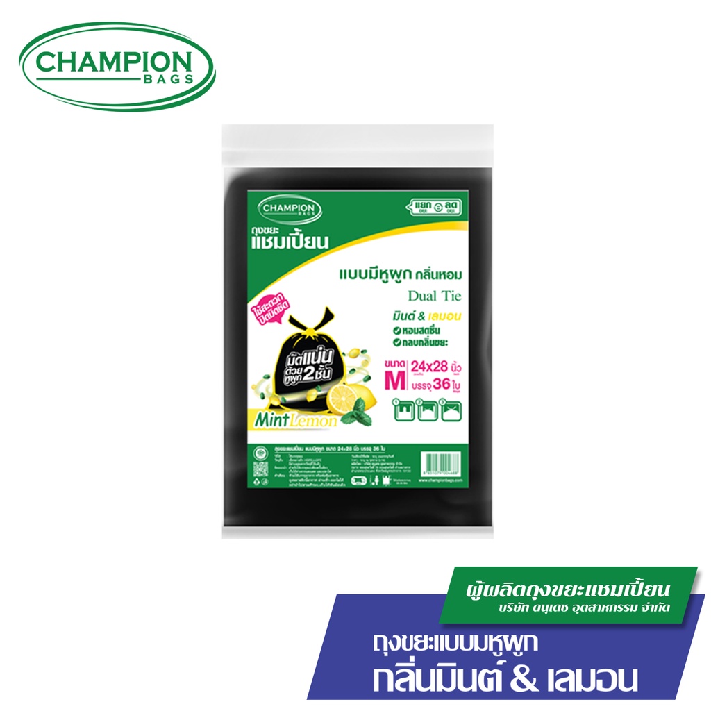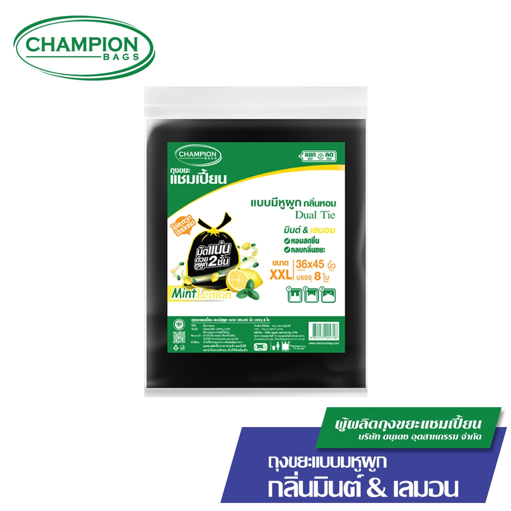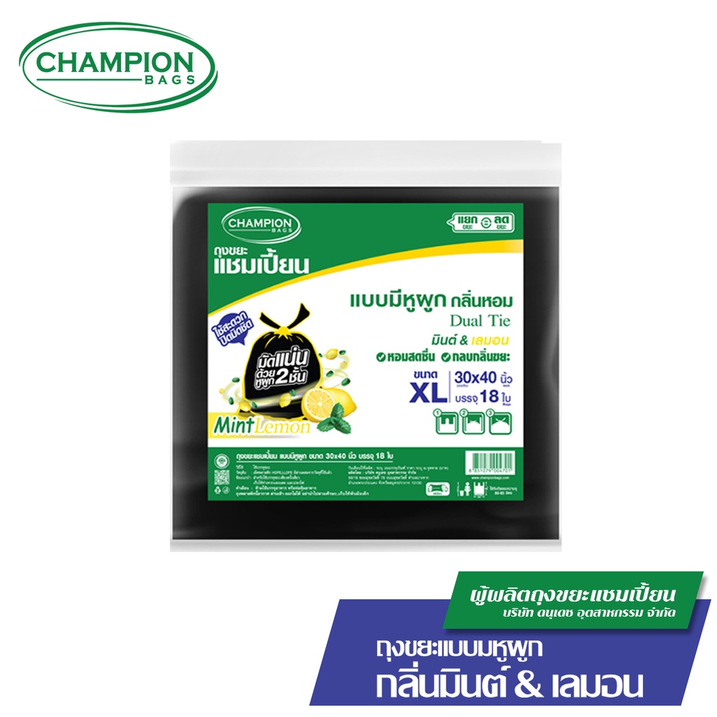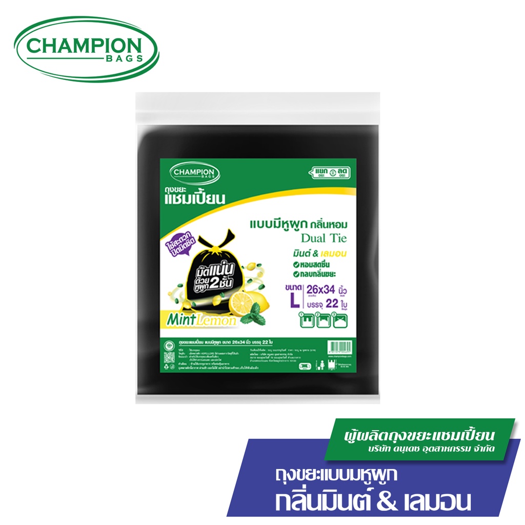 [สุดคุ้ม 3 แพ็ก]ช่วยกลบกลิ่นขยะ-Champion Bags ถุงขยะแชมเปี้ยน แบบหูผูก กลิ่นมินต์&เลมอน ปิดมิดชิดด้วยหูผูก 2 ชั้น