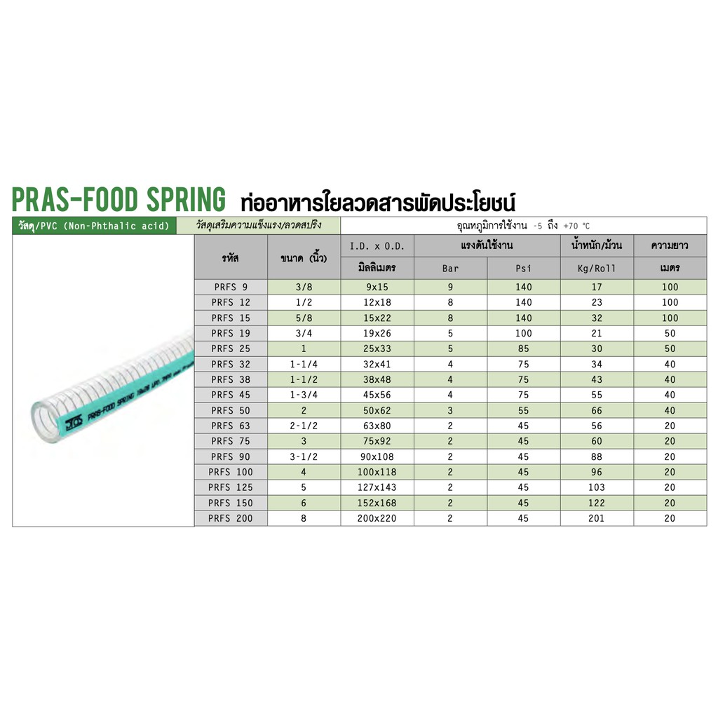 PRAS FOOD SPRING ท่ออาหารใยลวด PVC (Non-Phthalic acid) สารพัดประโยชน์ ขนาด 1-1/4 , 1-1/2 , 1-3/4 , 2 นิ้ว