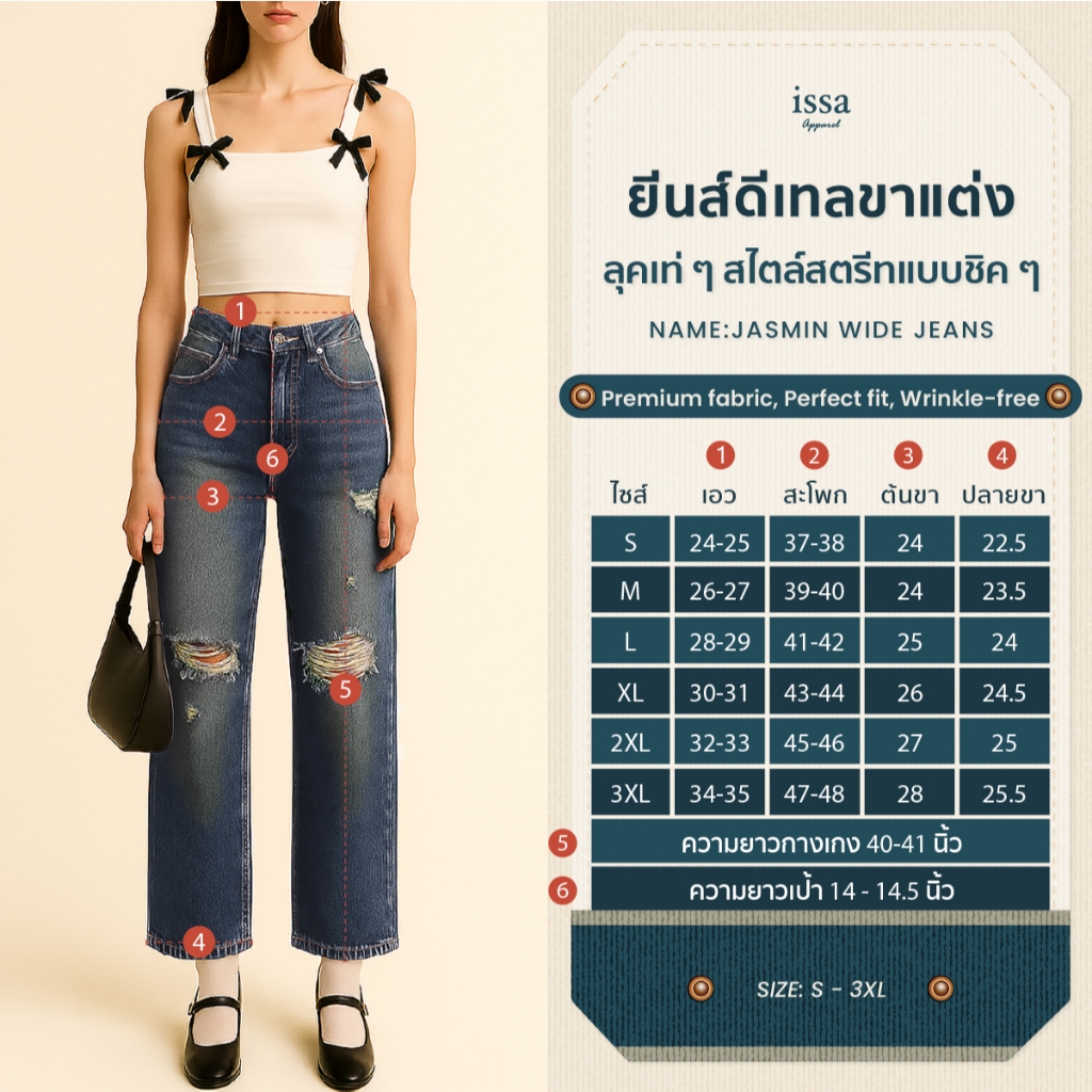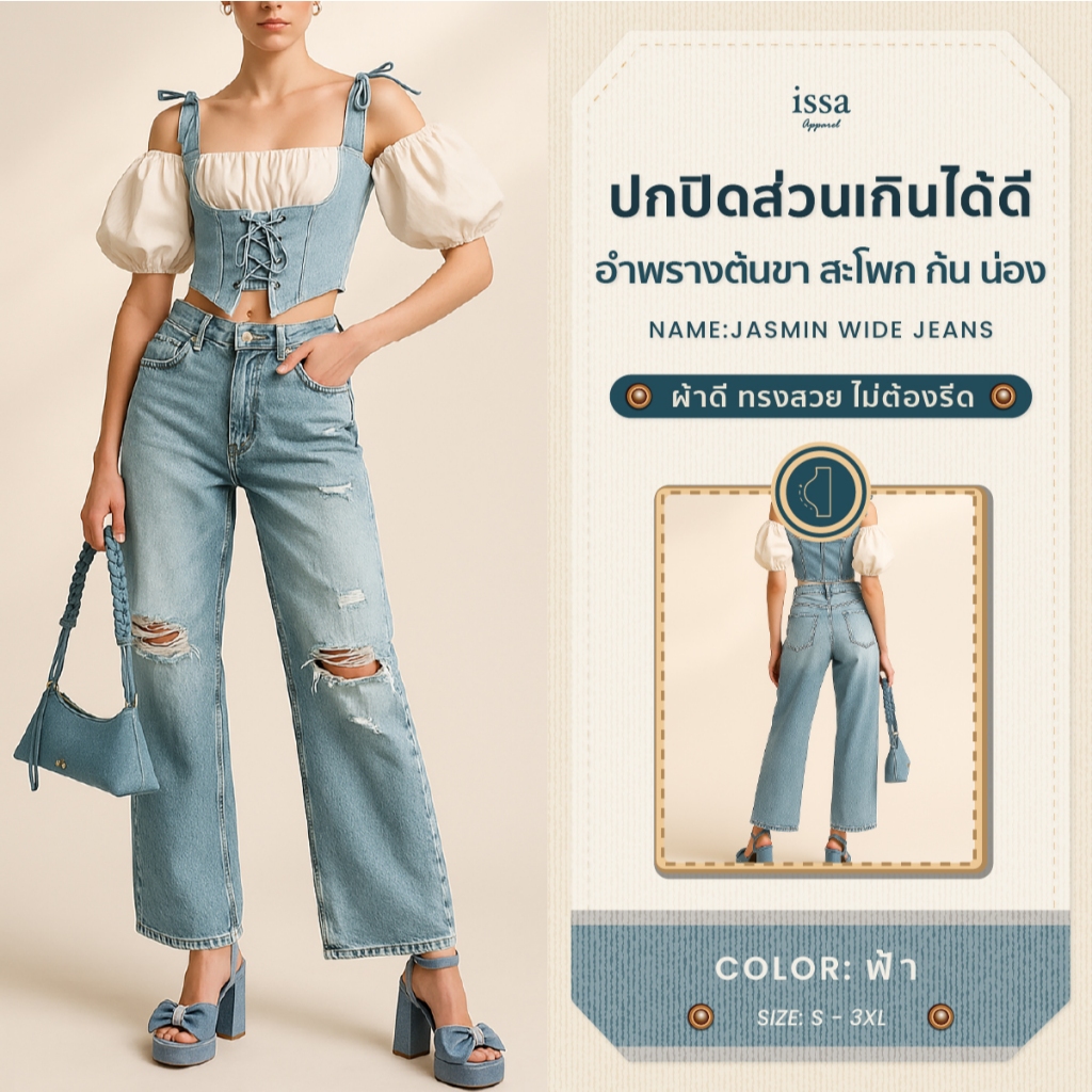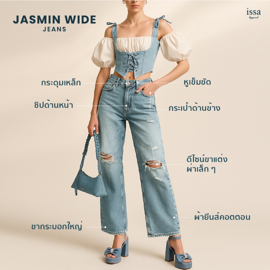 Jasmin Wide jeans กางเกงยีนส์กระบอกใหญ่ดีเทลขาแต่ง ผ้ายีนส์คอตตอนเนื้อดี มีน้ำหนักพอดี ไม่บาง ไม่หนาเกินไป ให้ความรู้สึก