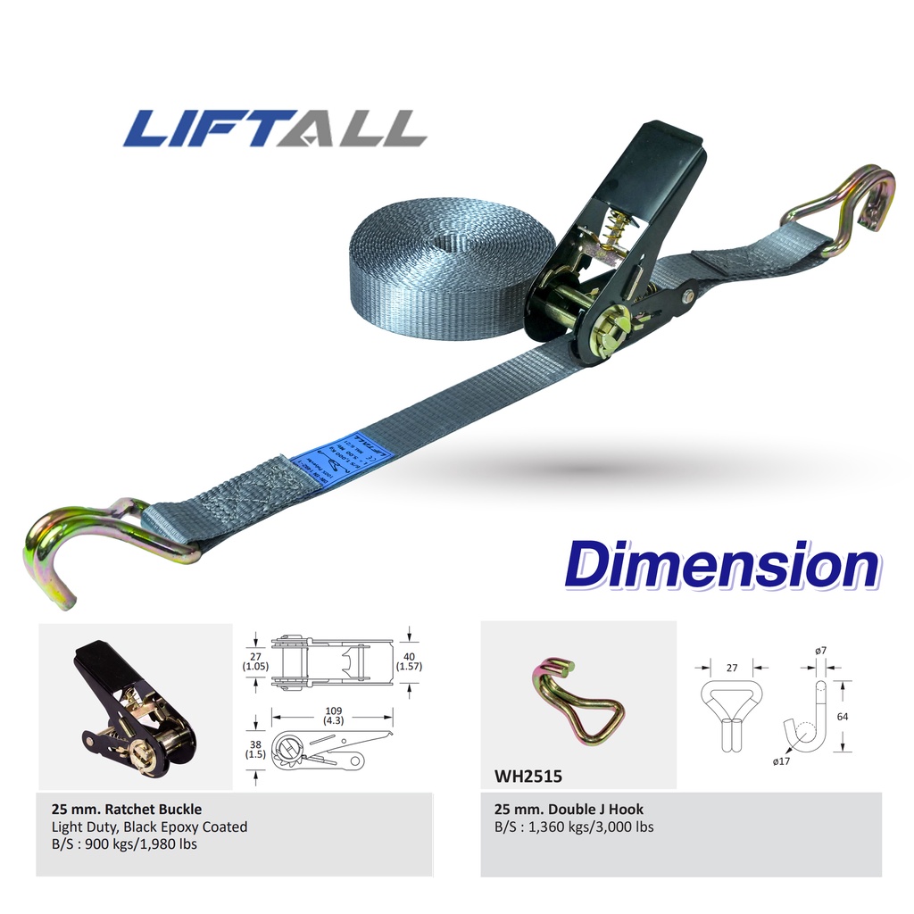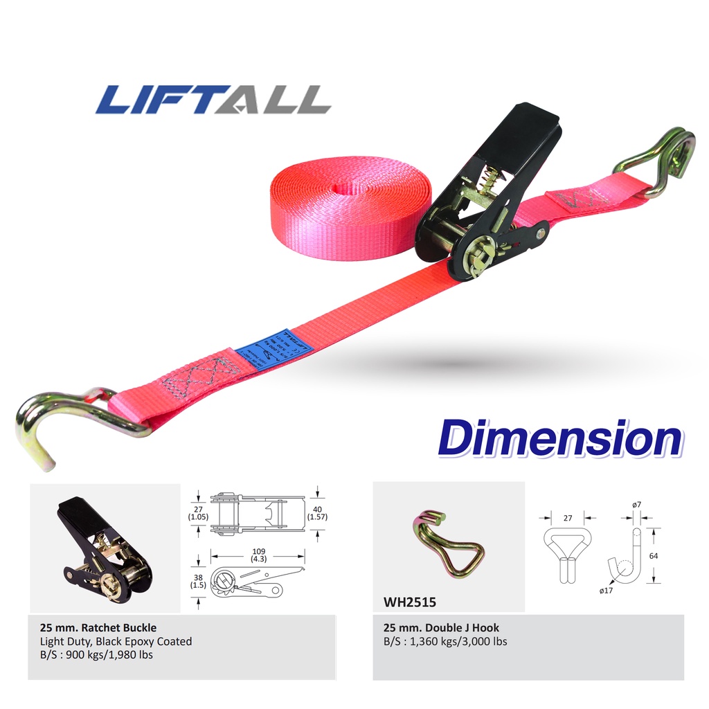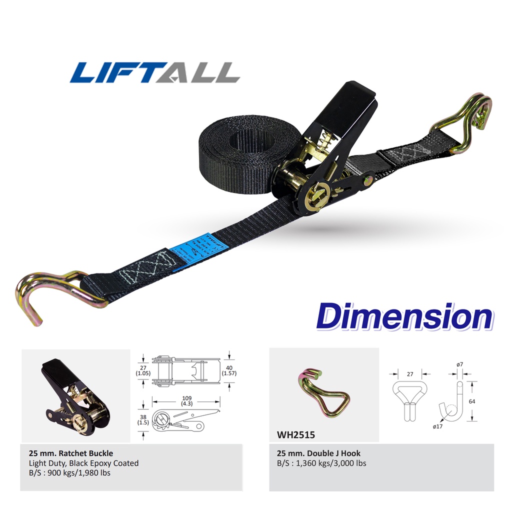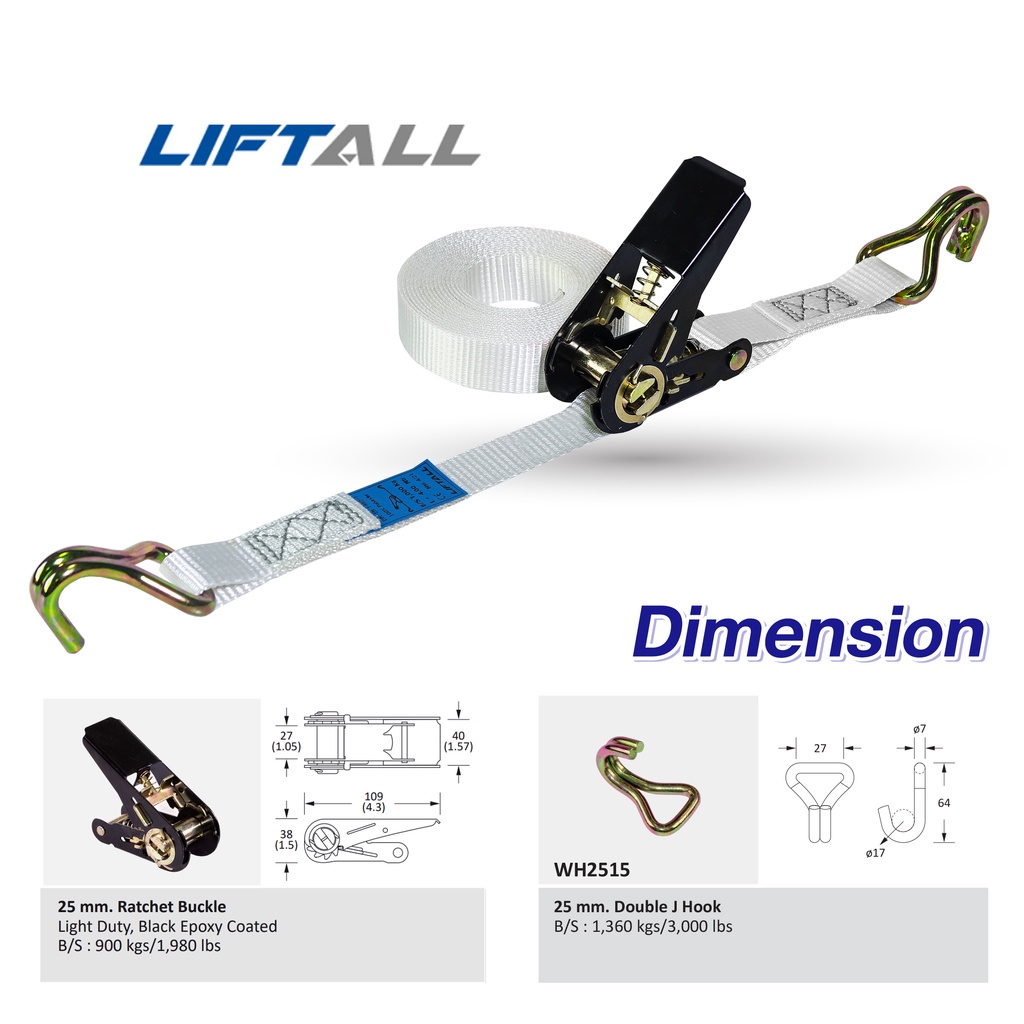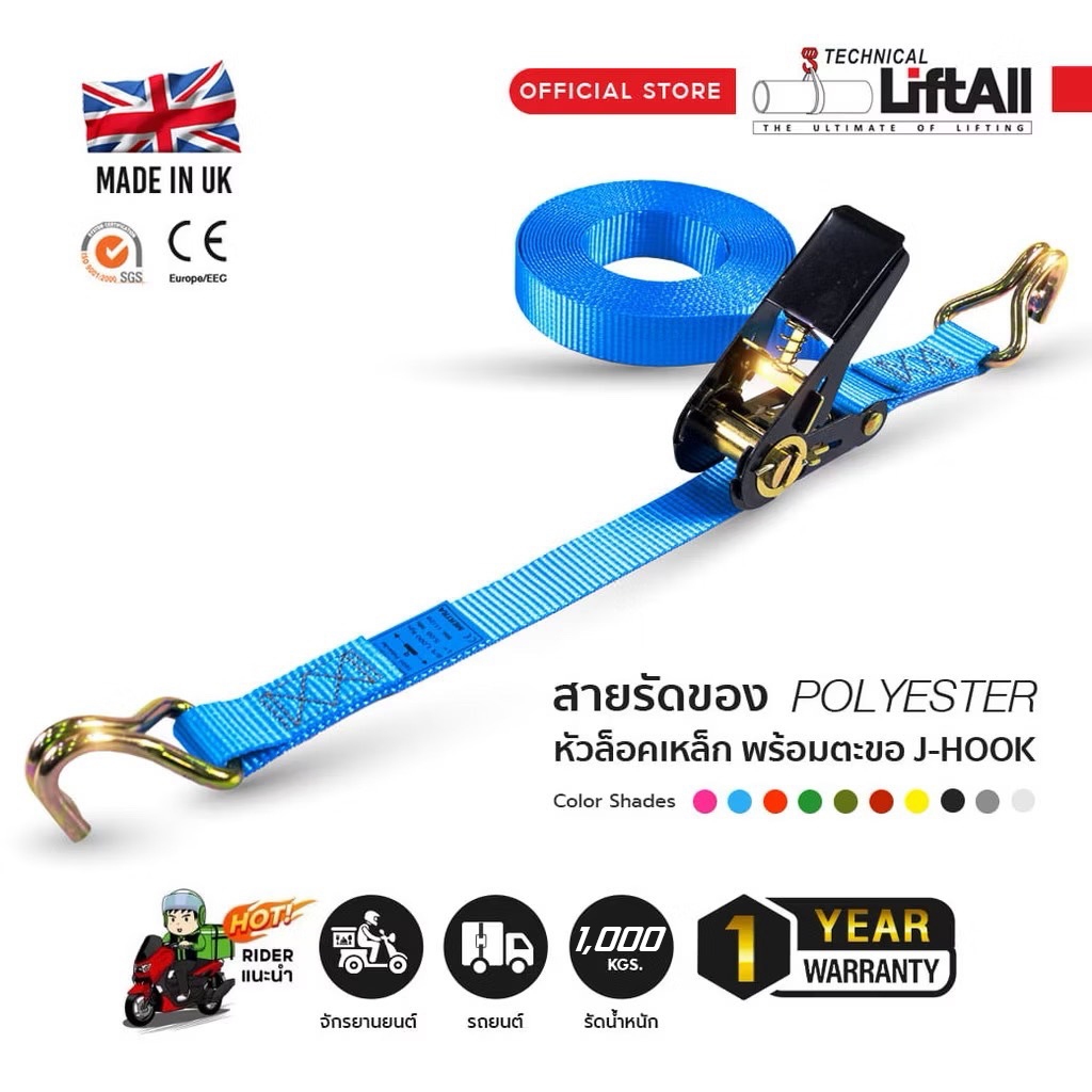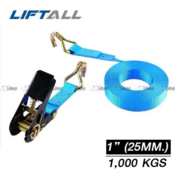 LIFTALL สายรัดของ ขนาด 1 นิ้ว รับ นน. 1 ตัน ชนิดมีตะขอ LSW2510B สายรัด ก๊อกแก๊ก สายเบลท์รัดของ เชือกรัดของ สายรัดรถกระบะ