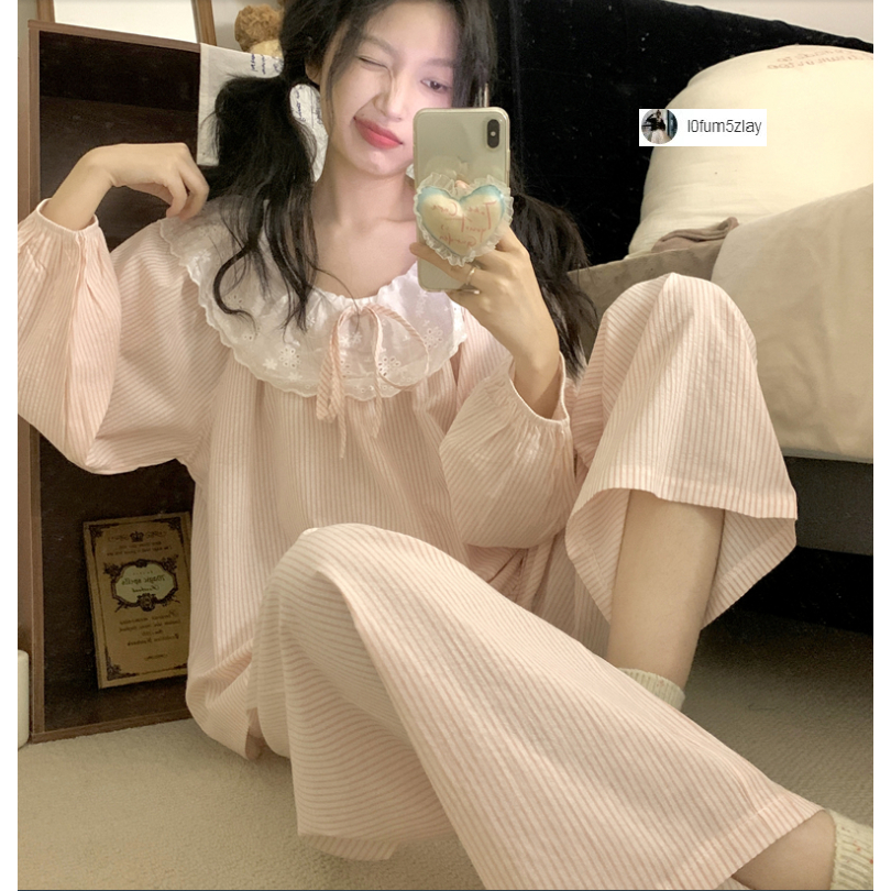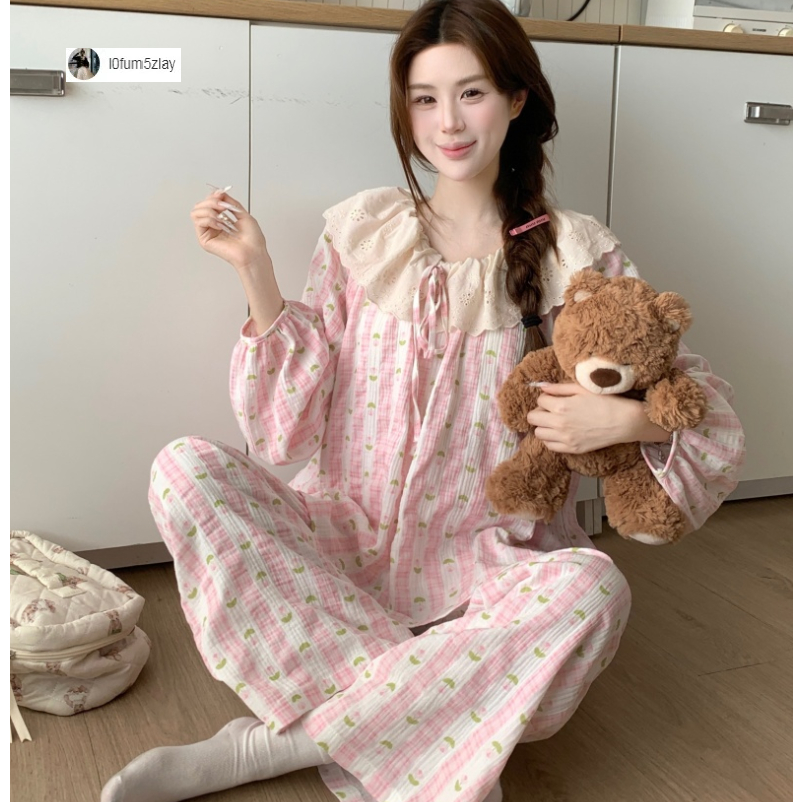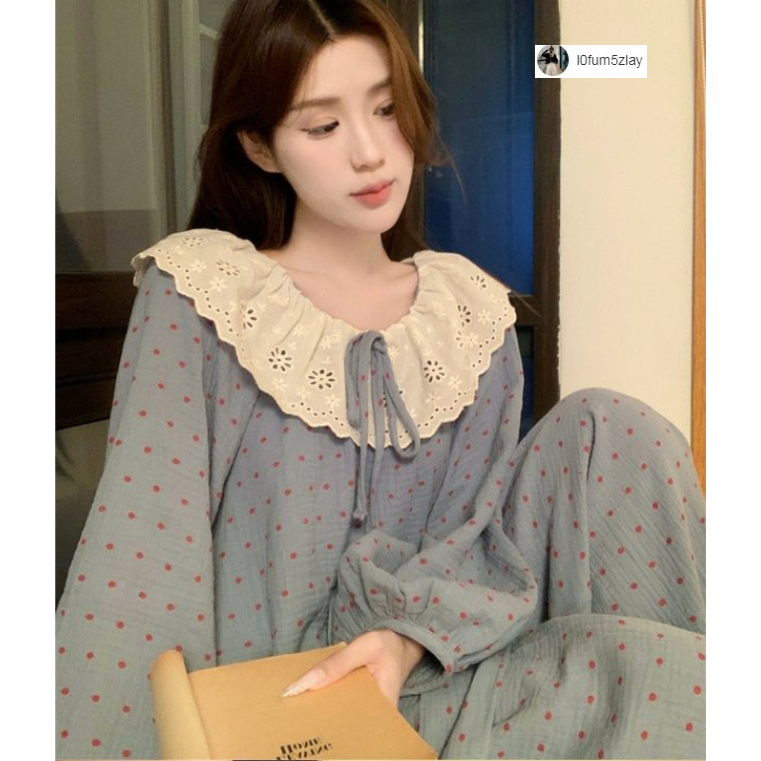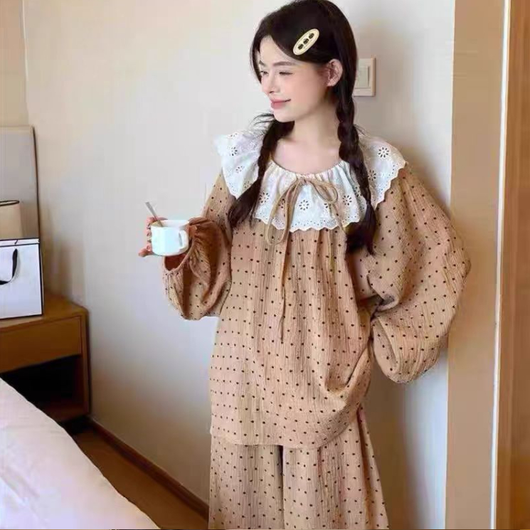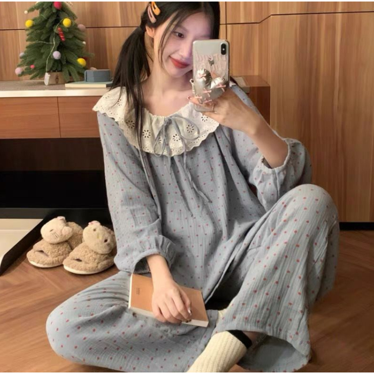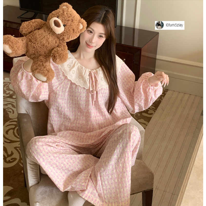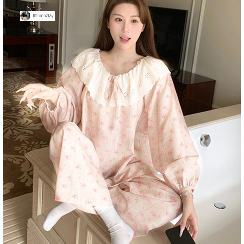 (ราคาถูกที่สุด) ชุดนอนผู้หญิง, ผ้าฝ้ายคุณภาพดี, ลูกไม้ที่สวยงาม, ขายาว+เสื้อ,M-2XL