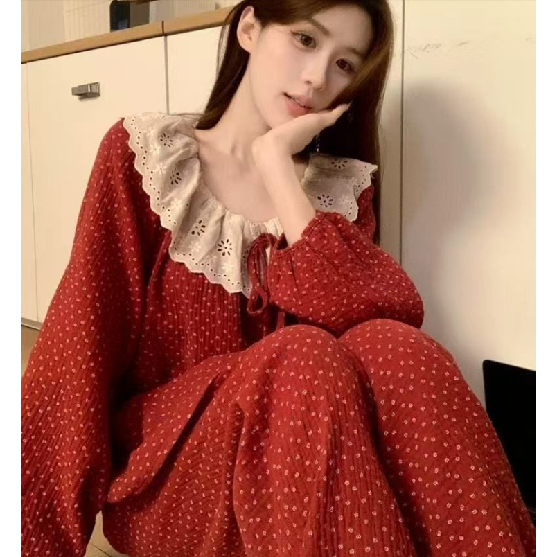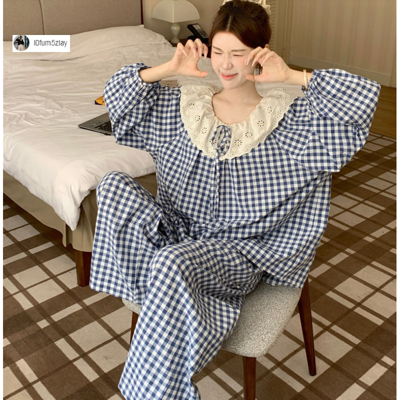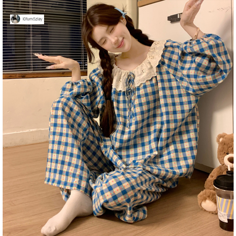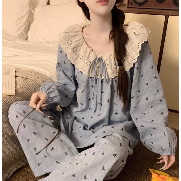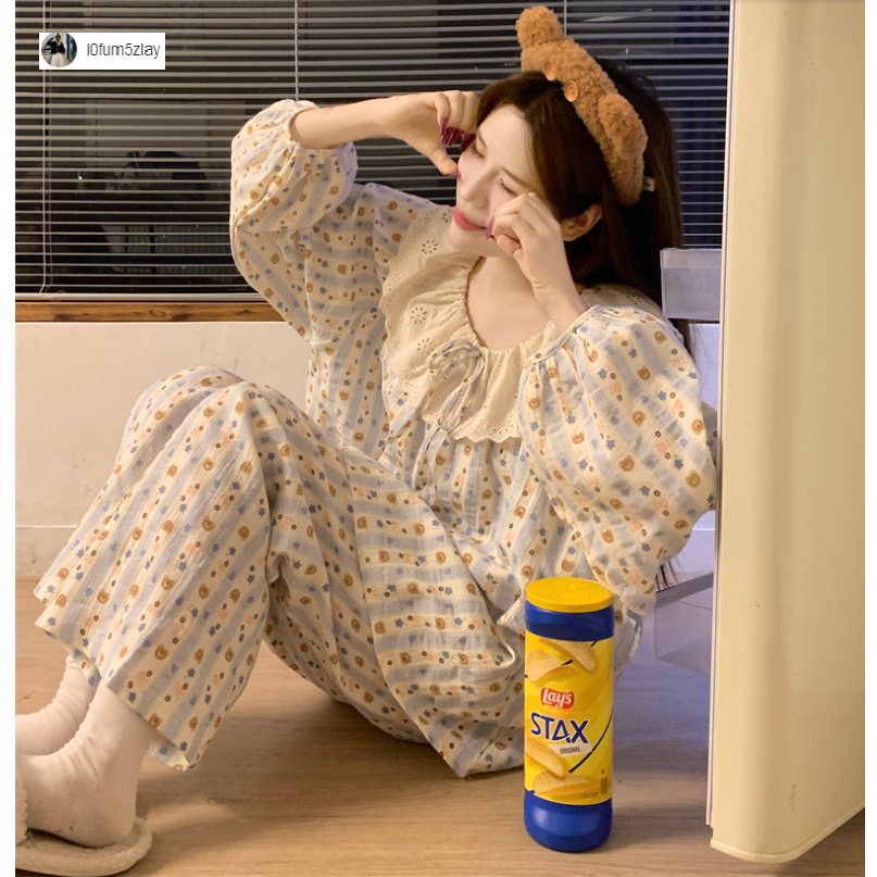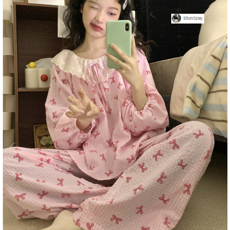 (ราคาถูกที่สุด) ชุดนอนผู้หญิง, ผ้าฝ้ายคุณภาพดี, ลูกไม้ที่สวยงาม, ขายาว+เสื้อ,M-2XL