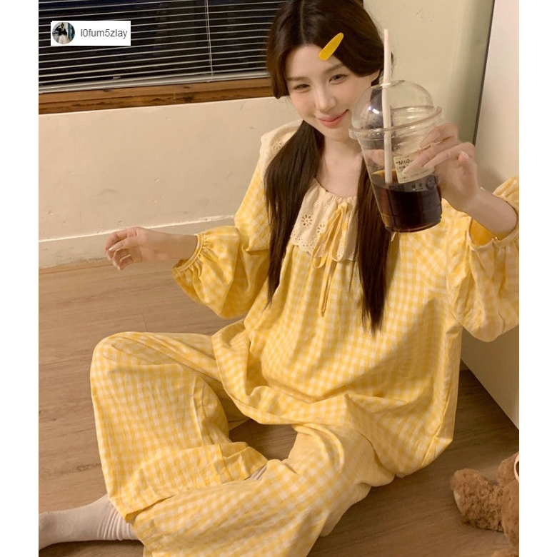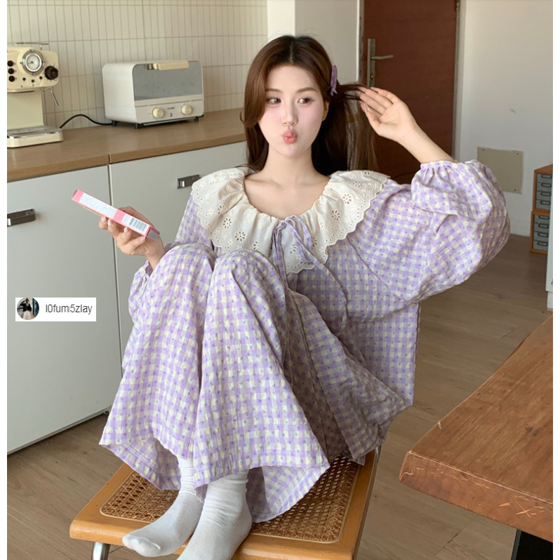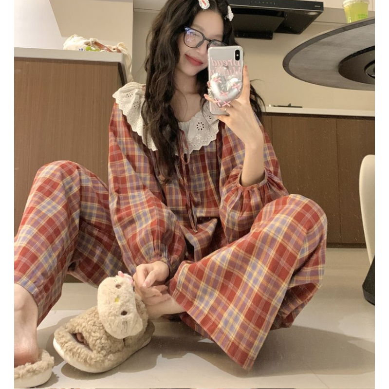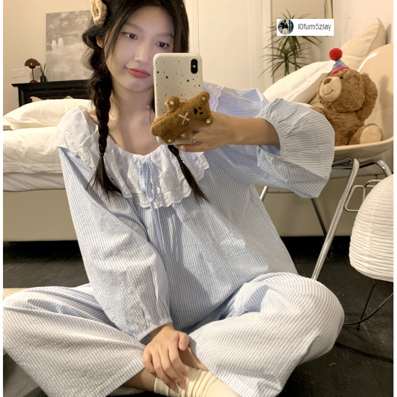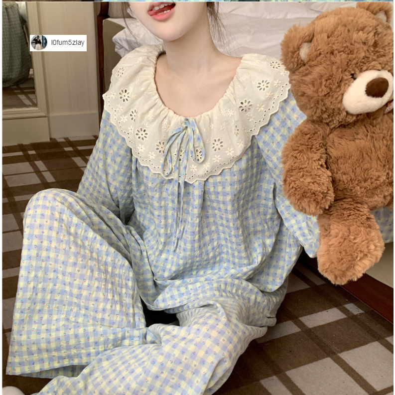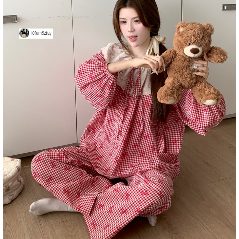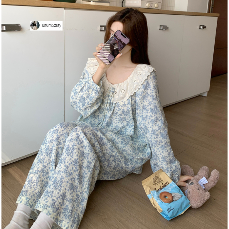 (ราคาถูกที่สุด) ชุดนอนผู้หญิง, ผ้าฝ้ายคุณภาพดี, ลูกไม้ที่สวยงาม, ขายาว+เสื้อ,M-2XL