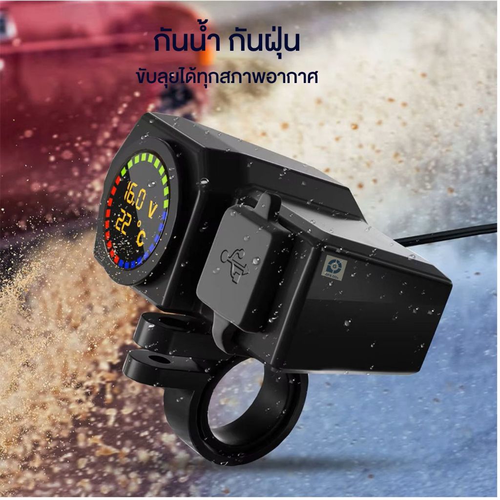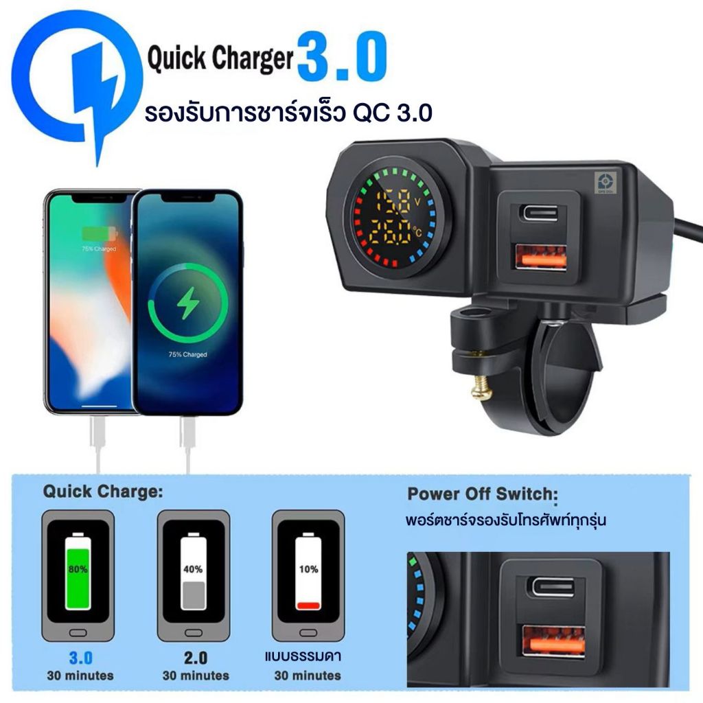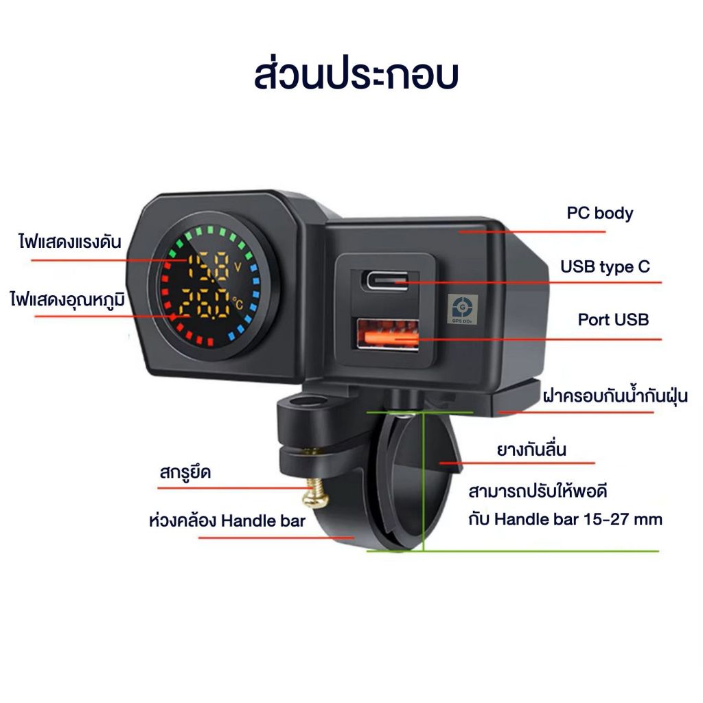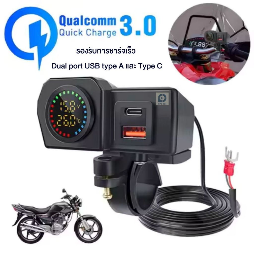gpsdd Port USB คู่แบบชาร์จเร็ว สำหรับรถมอเตอร์ไซค์ มีไฟแสดงแรงดันและแสดงอุณหภูมิ