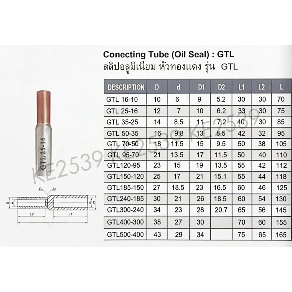 สลิปอลูมิเนียมหัวทองแดง GTL 16 25 35 50 70 95 120 หลอดต่ออลูมิเนียม สลิปต่อสาย ไบเมทัล Bimetal สลิปทองแดง