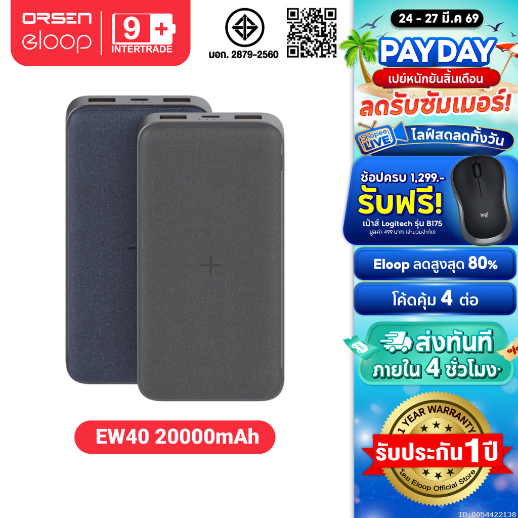 [640บ. ส่งด่วน] Orsen by Eloop EW40 แบตสำรองไร้สาย 20000mAh Wireless 15W Powerbank พาวเวอร์แบงค์ ชาร์จเร็ว Type C