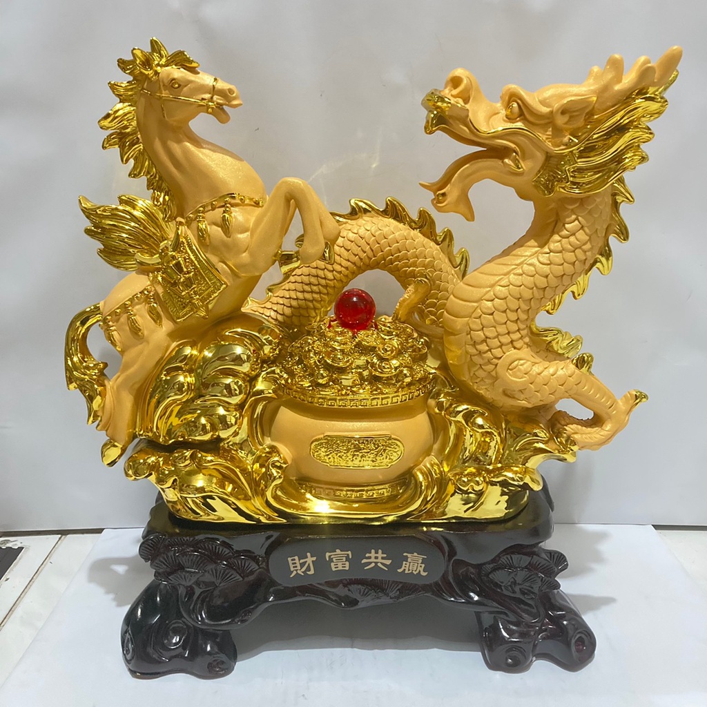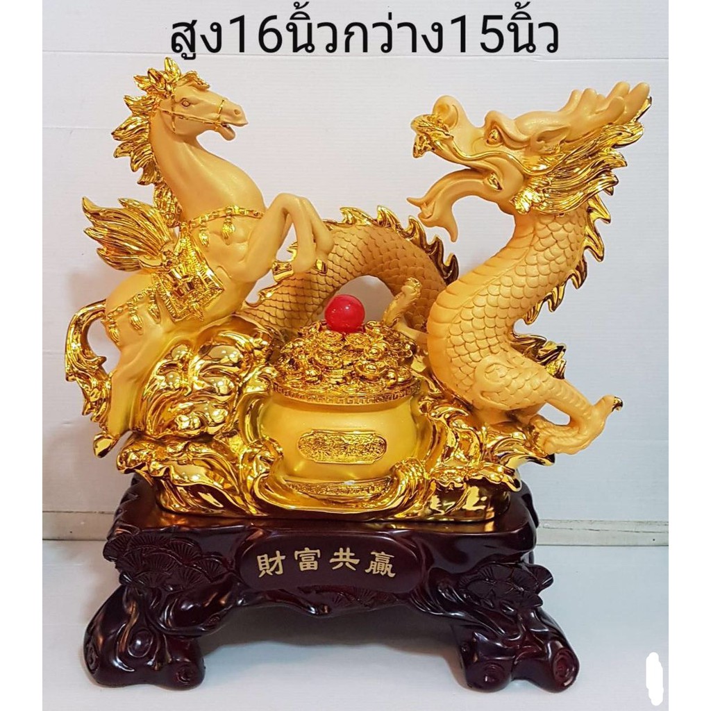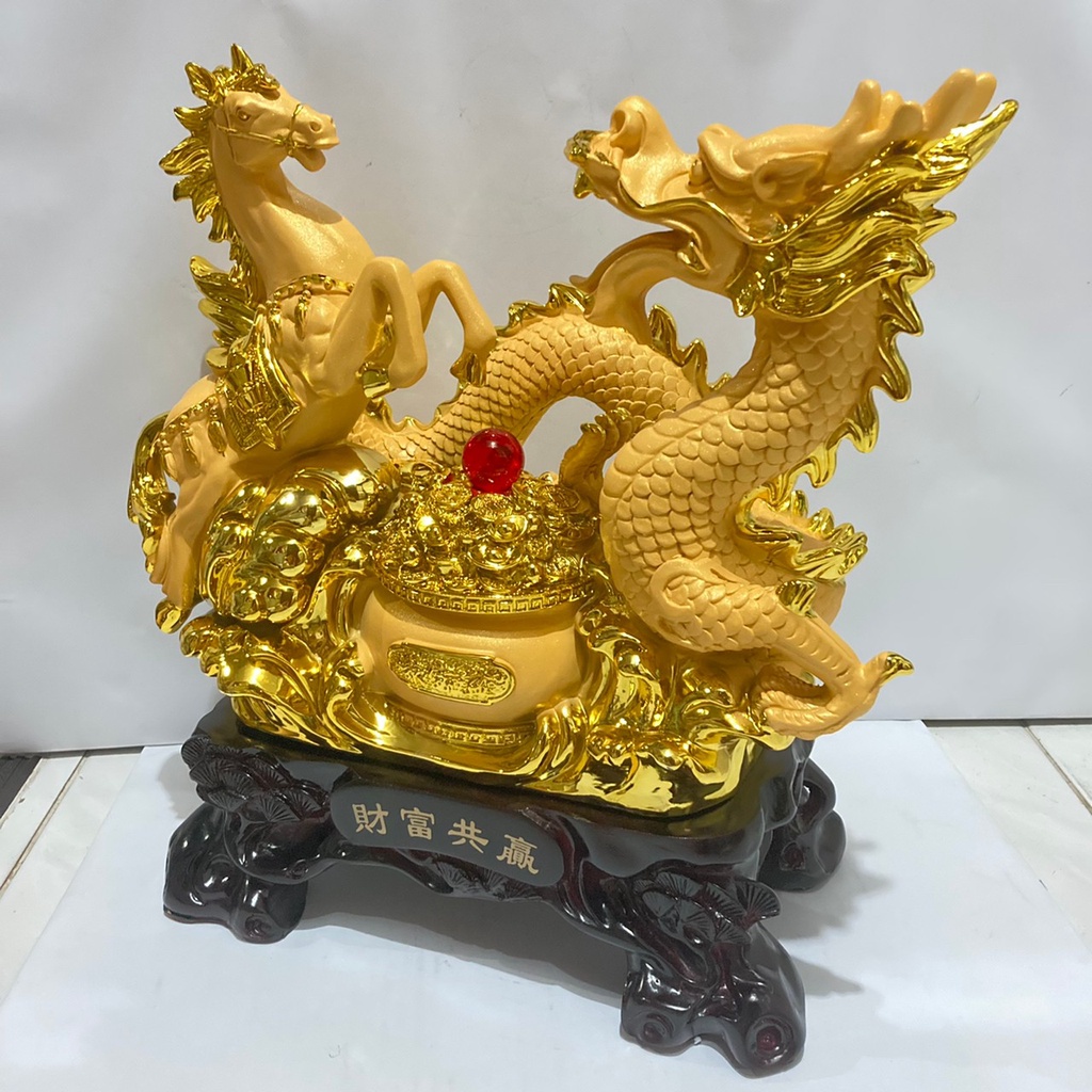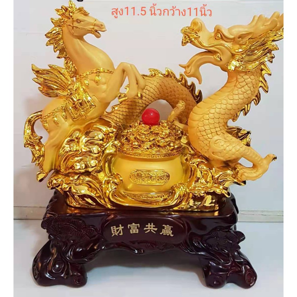 ม้าคู่มังกร ม้ามังกร มงคล กระถางทอง งานเรซิ่นพ่นทรายทอง / ไม้ ฐานสีไม้ สูง 11.5 / 16 นิ้ว