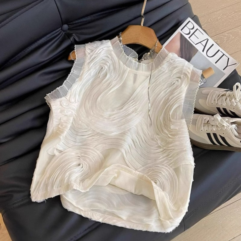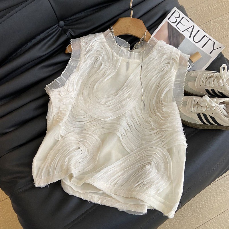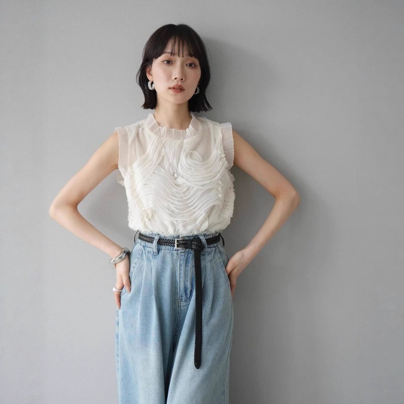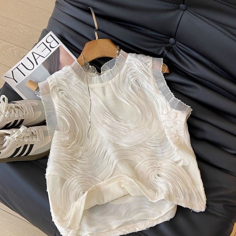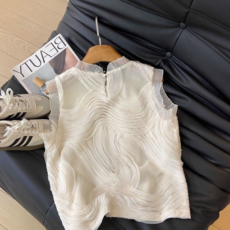 เสื้อเชิ้ตแขนกุดสไตล์ฝรั่งเศส วินเทจบานพอง ทำจากผ้าชีฟองคุณภาพ