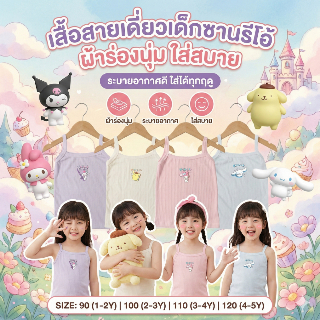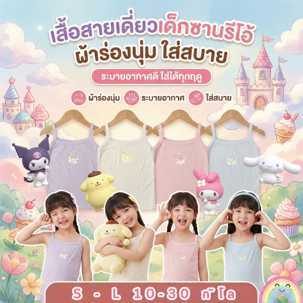 [NEW] ✨ เสื้อสายเดี่ยว สำหรับเด็ก ผ้าร่องนุ่ม ลายซานรีโอ้ ระบายอากาศดี ใส่สบาย ใส่ได้ทุกฤดู 10-30 กิโลกรัม 🧵💖