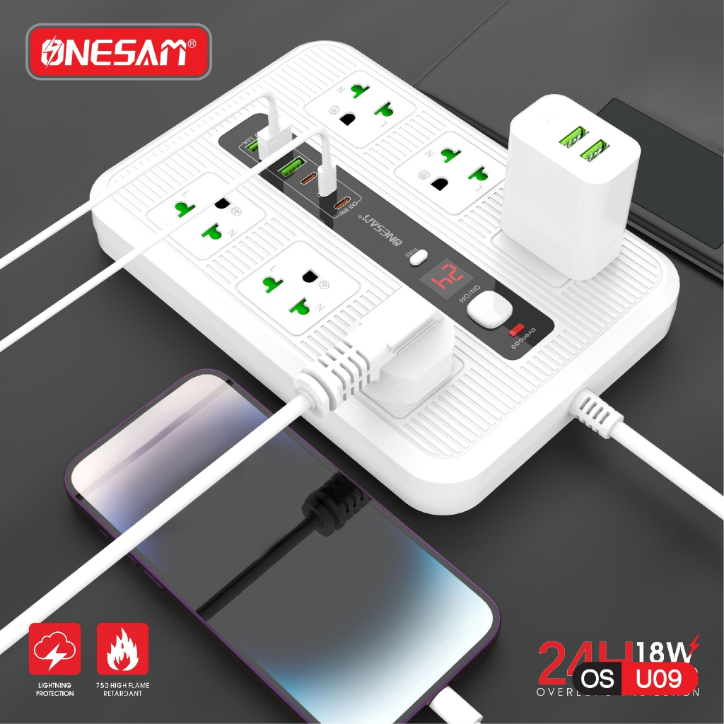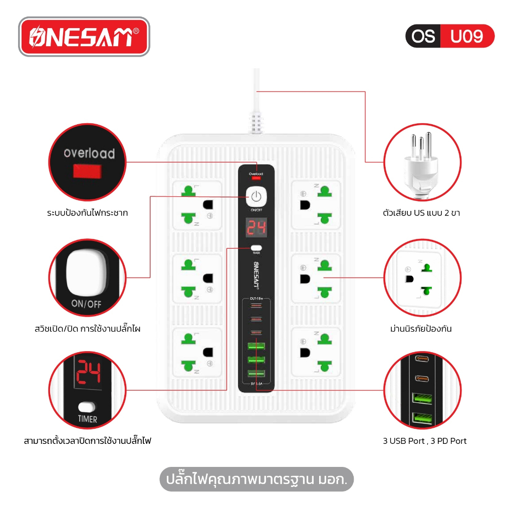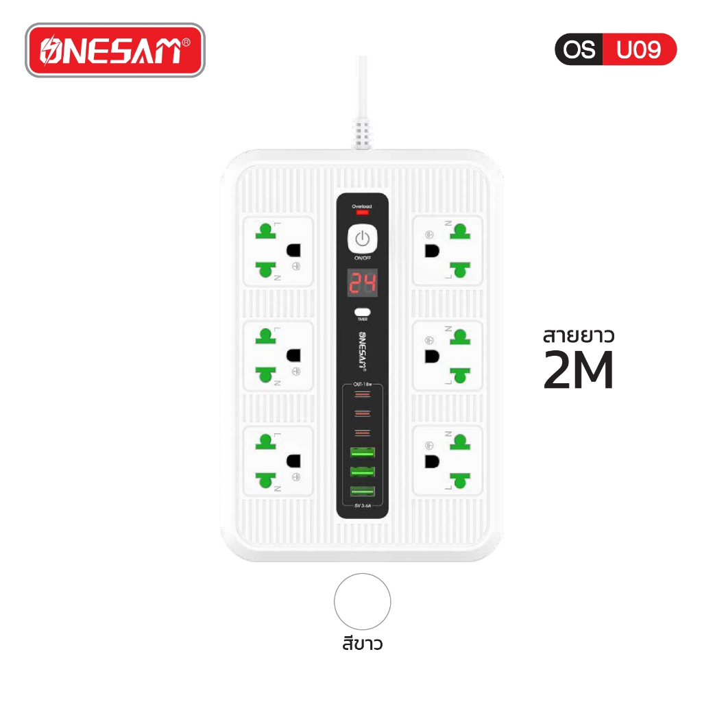 ปลั๊กไฟ ONESAM รุ่น OS-U09 3 USB พอร์ต และ 3 PD พอร์ต ชาร์จไว 3.6A สายยาว 2,5 เมตร ของแท้ 100% รับประกัน 1 ปี