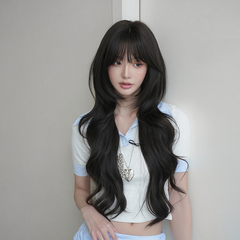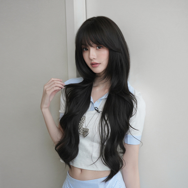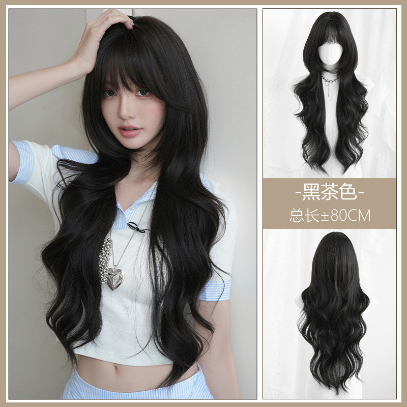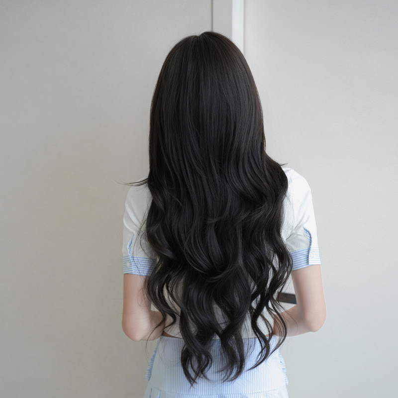 วิกผมหญิงทรงผมหยิกยาวคลื่นสีดำ พร้อมเส้นใยเคมีจำลองผมคุณภาพสูง