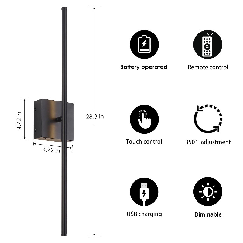โคมไฟติดผนังชาร์จไร้สาย, สวิตช์สัมผัสแบบใช้แบตเตอรี่ โคมไฟติดผนังสีดําพร้อมรีโมทคอนโทรล, ห้องนอนห้องโถงห้องนั่งเล่นโคมไฟในร่ม
