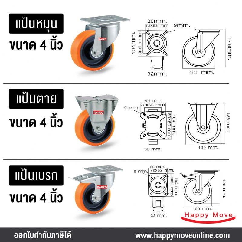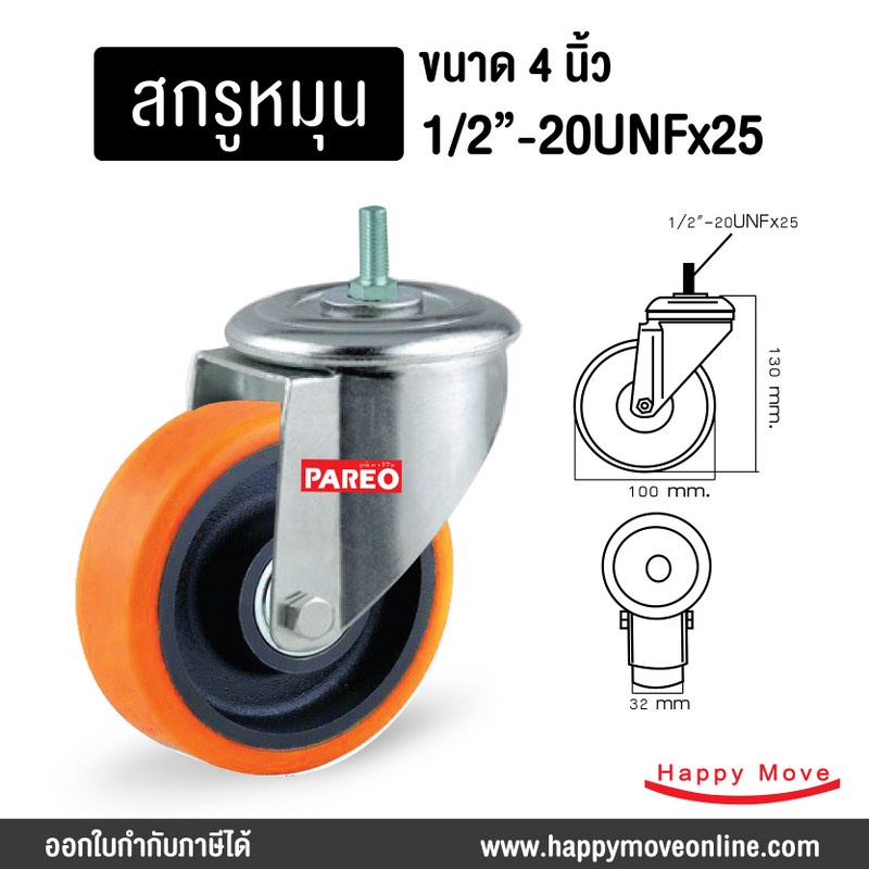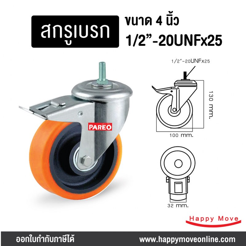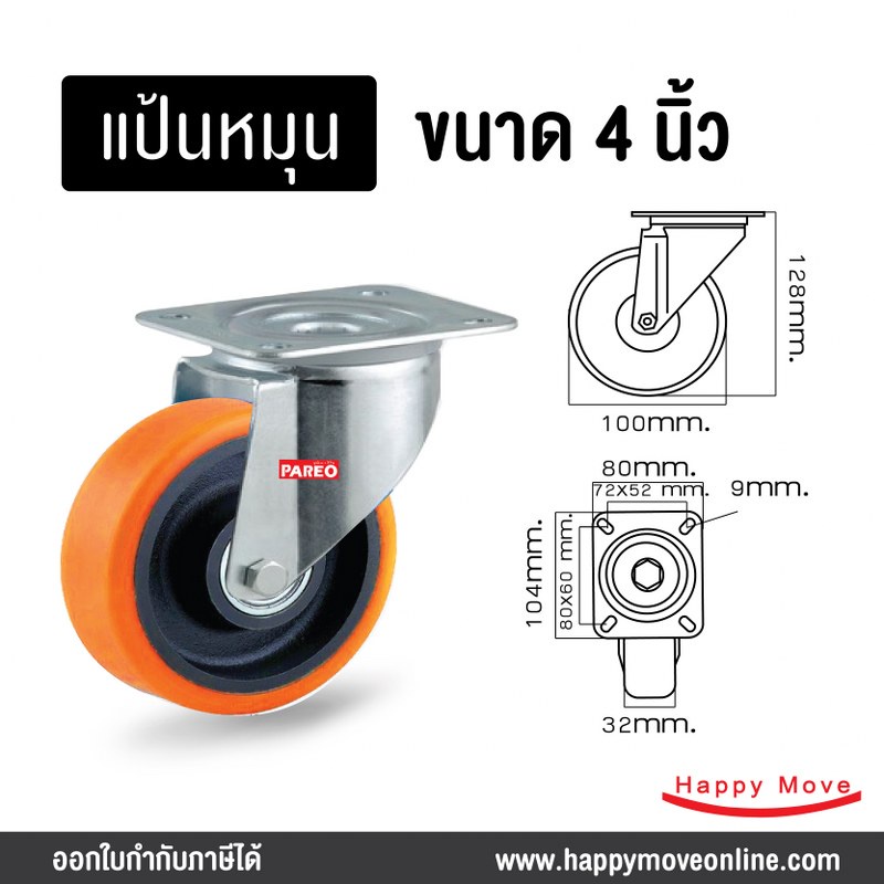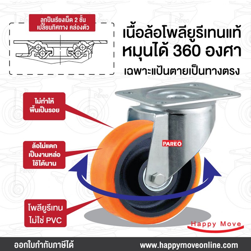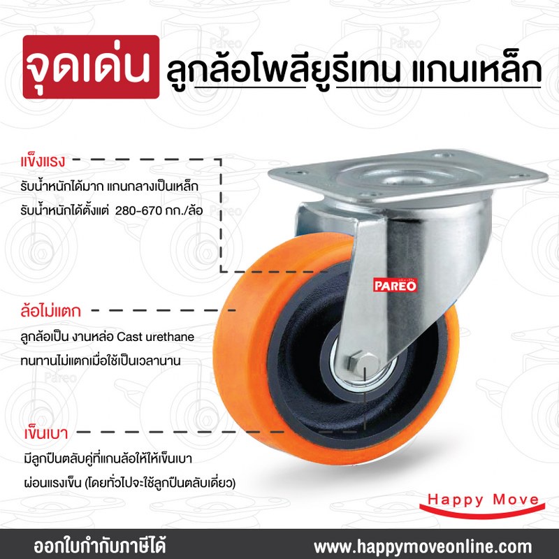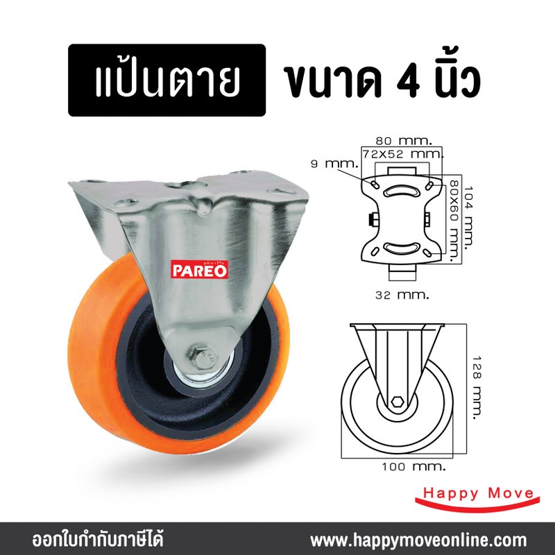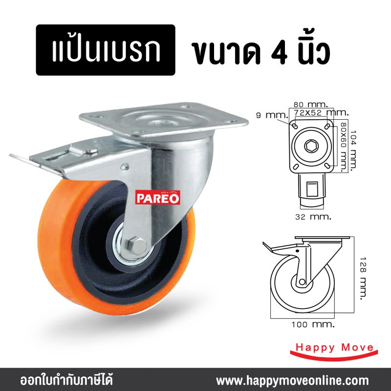 ล้อรถเข็นของ 4 นิ้ว (100มม.) ล้อโพลียูรีเทน ล้อไม่ทำพื้นเป็นรอย ล้อไม่แตก รับได้ 125-188 กก.รุ่น Value ยี่ห้อ PAREO