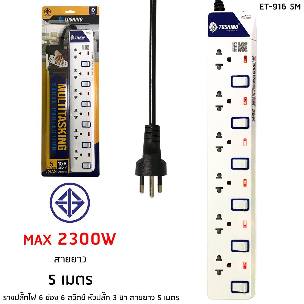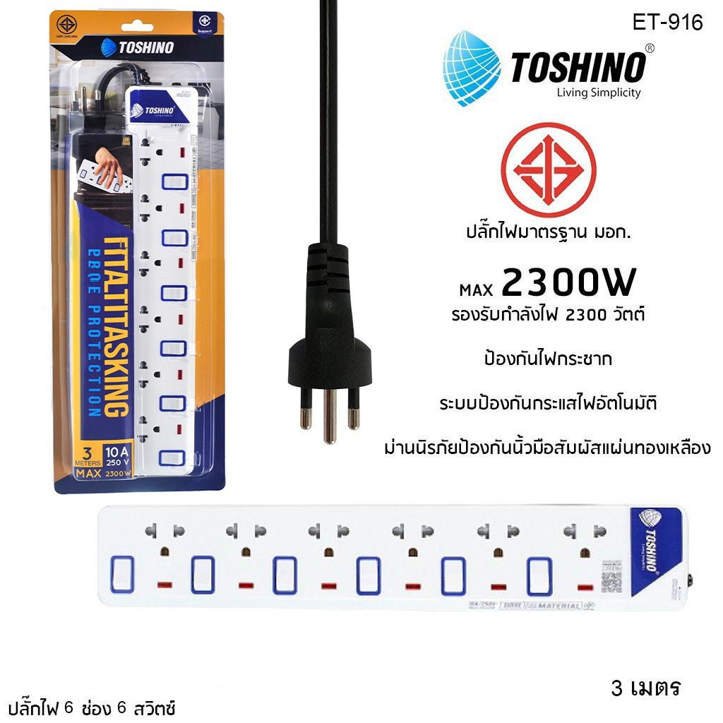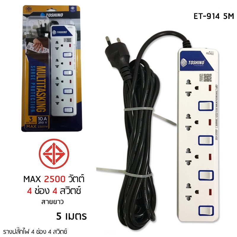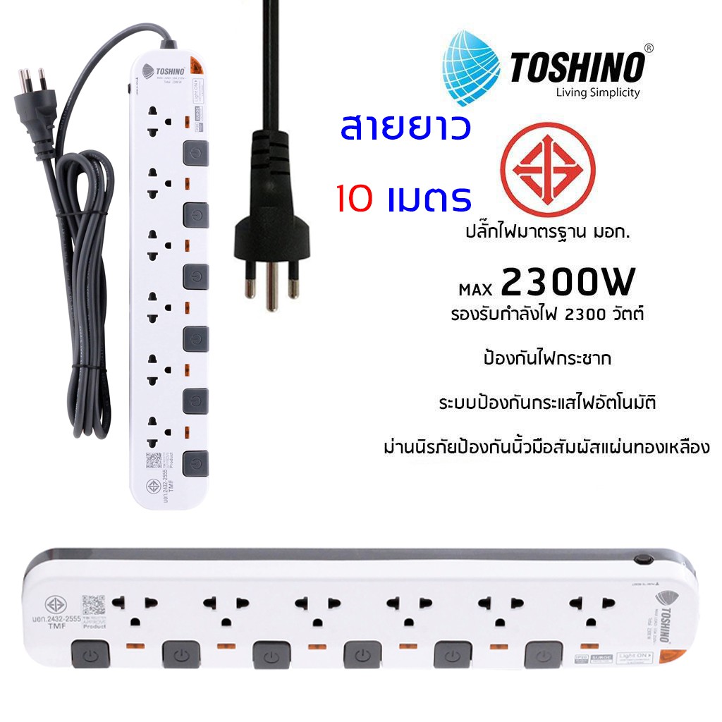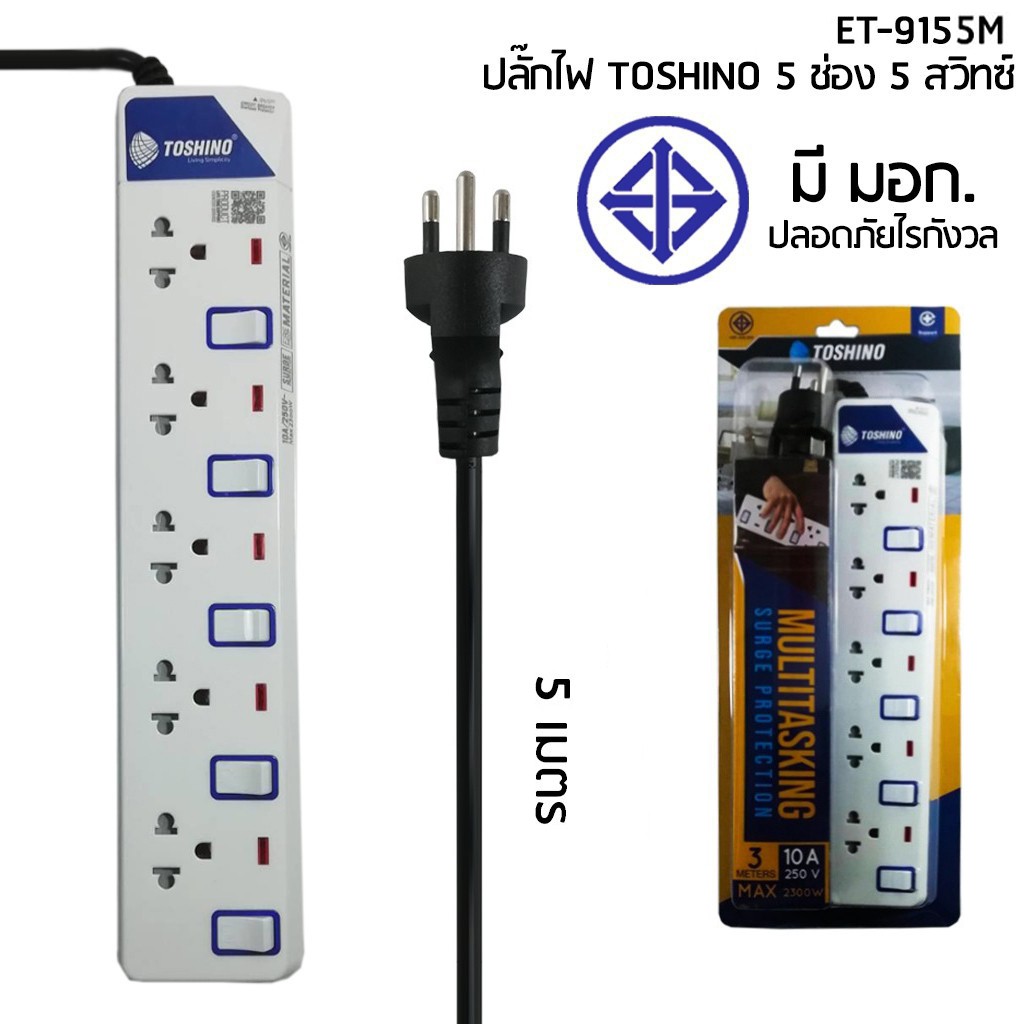 ‼️ถูกที่สุด ปลั๊กไฟ ปลั๊กพ่วง มอก. ยี่ห้อ Toshino มี 2/3/4/5/6 ช่อง สายไฟยาว 3เมตร 5เมตร 10เมตร !!ฟรีตัวแปลงขา
