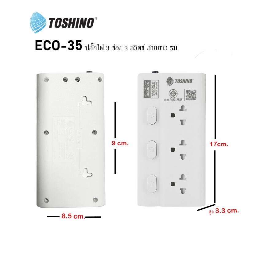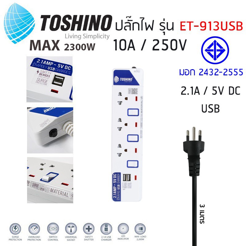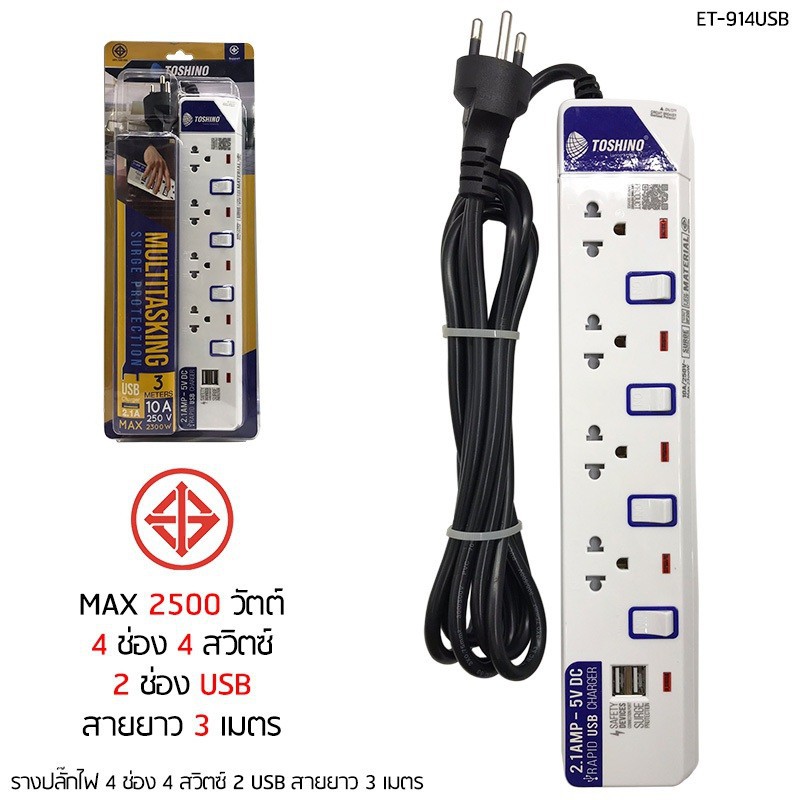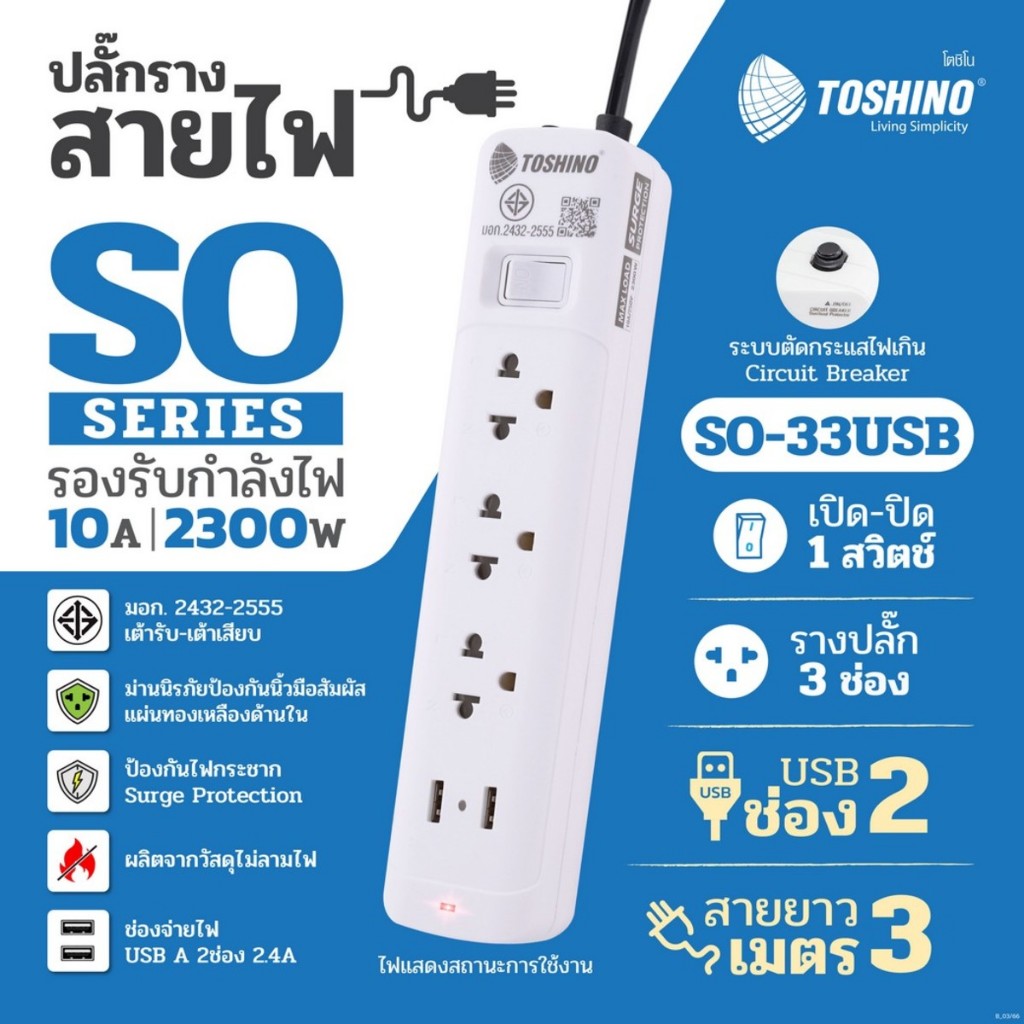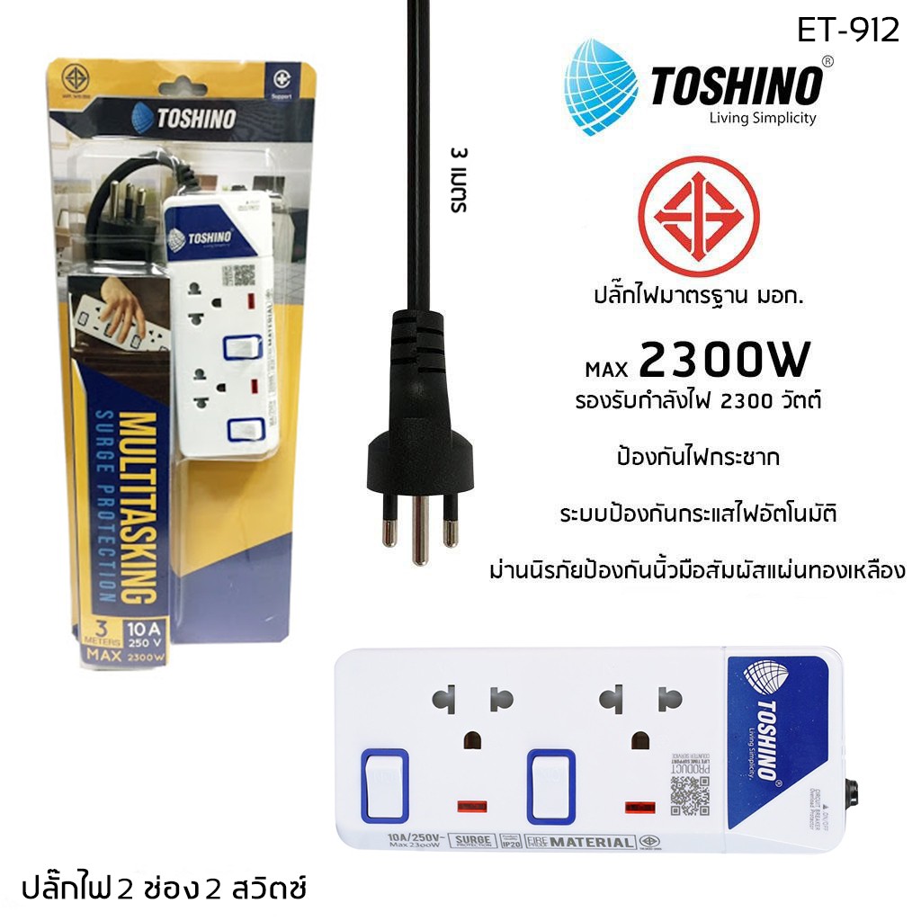 ‼️ถูกที่สุด ปลั๊กไฟ ปลั๊กพ่วง มอก. ยี่ห้อ Toshino มี 2/3/4/5/6 ช่อง สายไฟยาว 3เมตร 5เมตร 10เมตร !!ฟรีตัวแปลงขา
