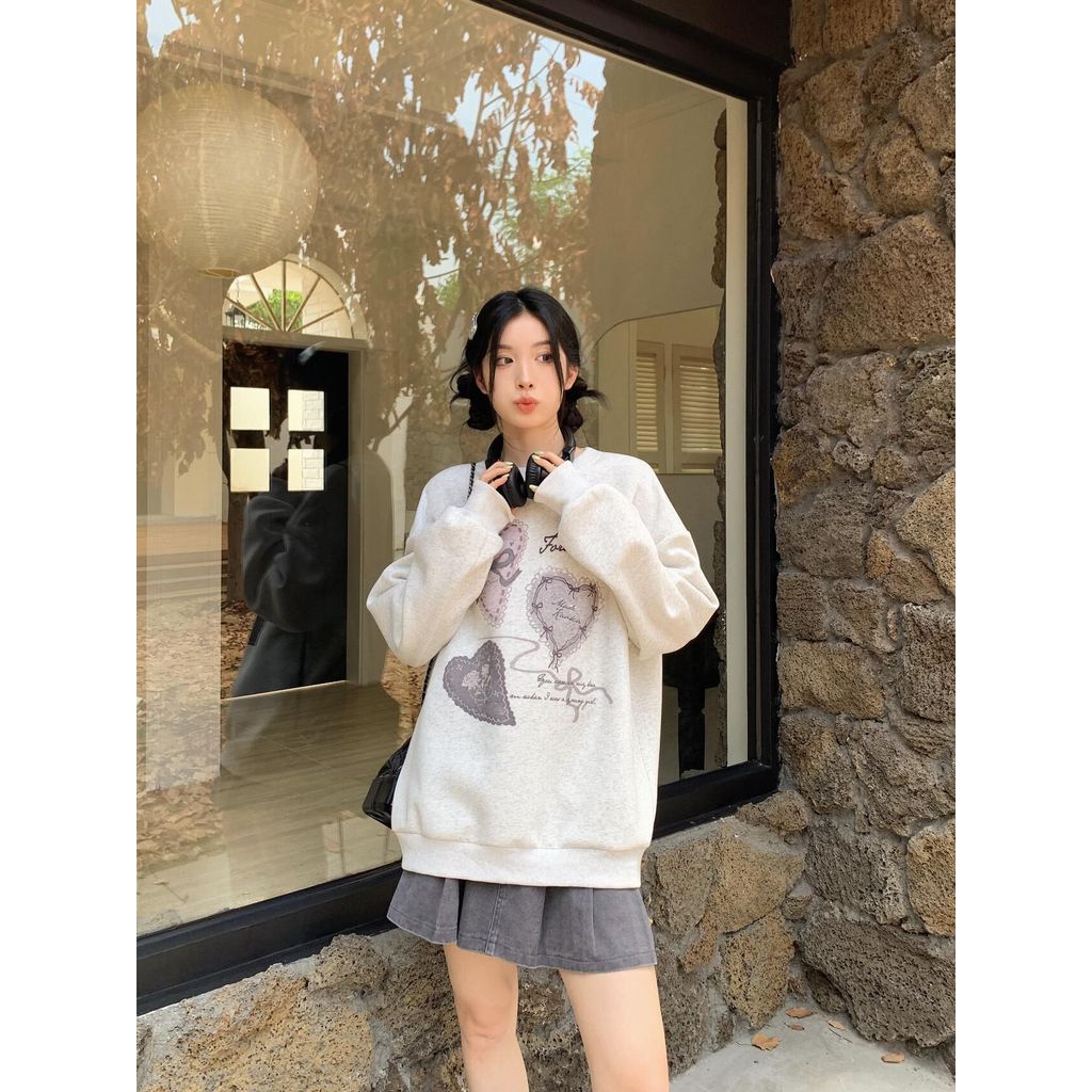 เสื้อกันหนาวผู้หญิงสไตล์เกาหลี ออกแบบโรแมนติก พิมพ์ลายหัวใจรอบคอด้วยโพลีเอสเตอร์ ให้ความสะดวกสบายทุกวัน